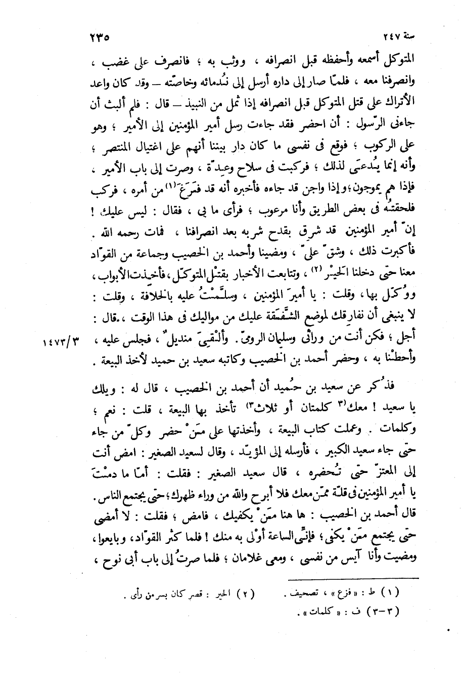 أجل، فكن أنت من ورائي وسليمان الرومي وألقي منديل، فجلس عليه، وأحطنا به، وحضر أحمد بن الخصيب وكاتبه سعيد بن حميد لأخذ البيعة.