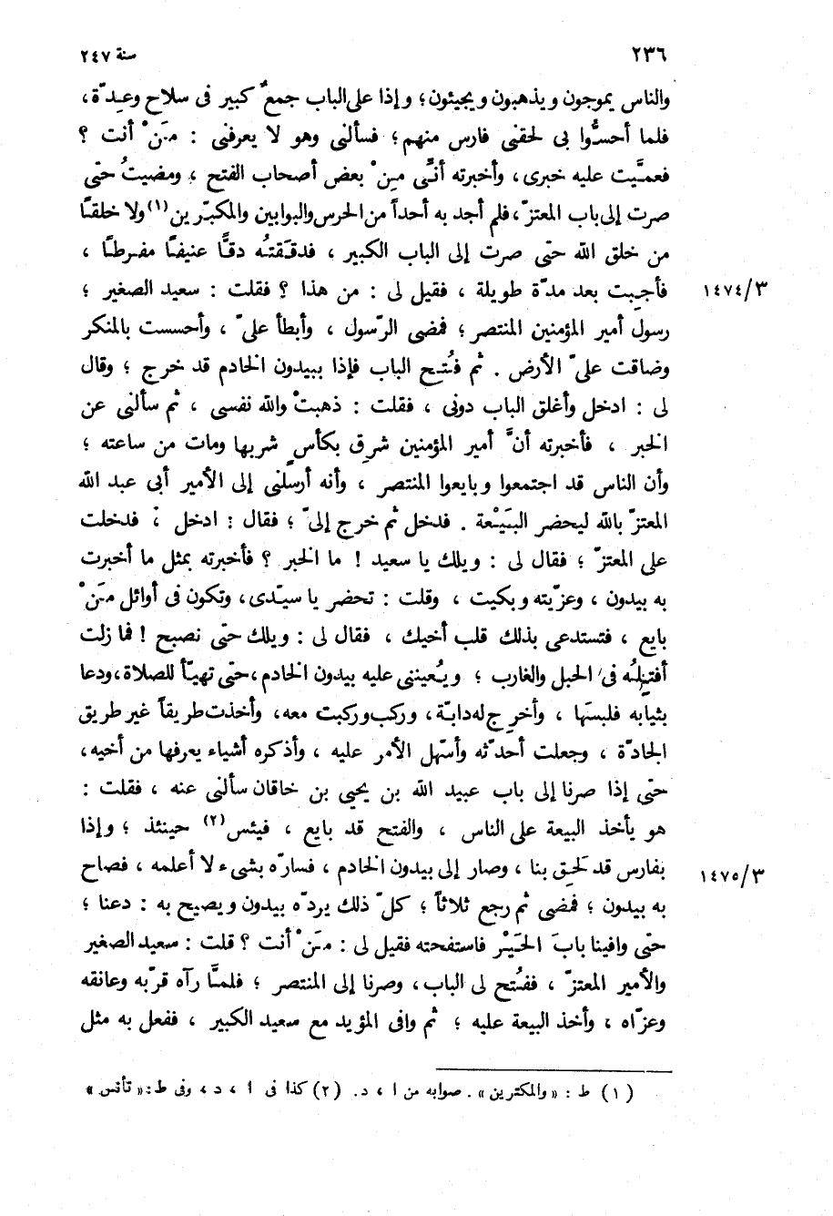 هو يأخذ البيعه على الناس، والفتح قد بايع، فيئس حينئذ، وإذا بفارس قد لحق بنا، وصار إلى بيدون الخادم، فساره بشيء لا أعلمه، فصاح به بيدون، فمضى ثم رجع ثلاثا، كل ذلك يرده بيدون ويصيح به: دعنا، حتى وافينا باب الحير فاستفتحه فقيل لي: من أنت؟ قلت: سعيد الصغير والأمير المعتز، ففتح لي الباب، وصرنا إلى المنتصر، فلما رآه قربه وعانقه وعزاه، وأخذ البيعة عليه، ثم وافى المؤيد مع سعيد الكبير، ففعل به مثل