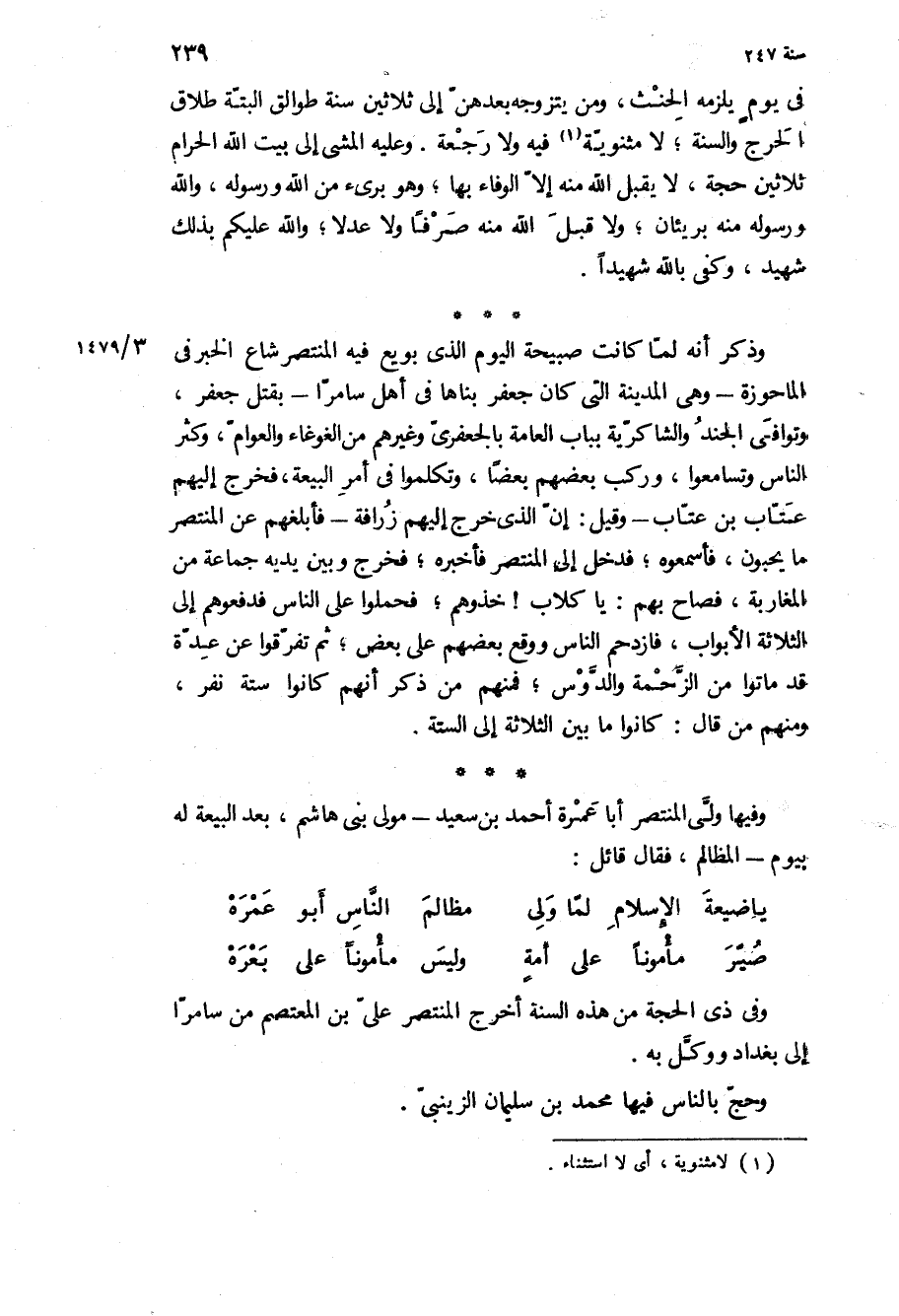 وفيها ولي المنتصر أبا عمرة أحمد بن سعيد- مولى بني هاشم، بعد البيعة له بيوم- المظالم، فقال قائل: