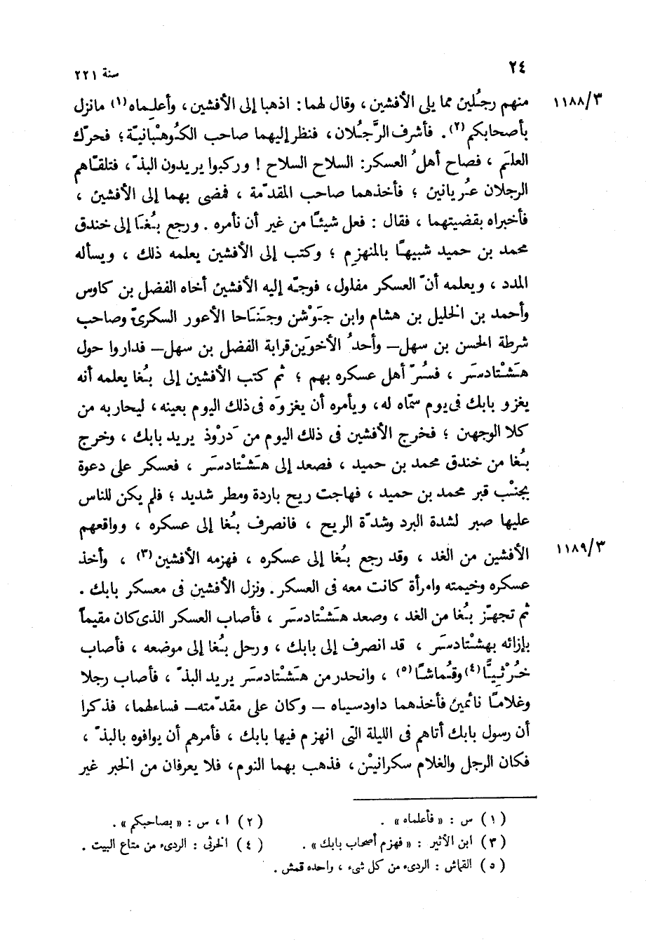 منهم رجلين مما يلي الأفشين، وقال لهما: اذهبا إلى الأفشين، وأعلماه ما نزل بأصحابكم فأشرف الرجلان، فنظر إليهما صاحب الكوهبانية، فحرك العلم، فصاح أهل العسكر: السلاح السلاح! وركبوا يريدون البذ، فتلقاهم الرجلان عريانين، فأخذهما صاحب المقدمة، فمضى بهما إلى الأفشين، فأخبراه بقضيتهما، فقال: فعل شيئا من غير أن نأمره ورجع بغا إلى خندق محمد بن حميد شبيها بالمنهزم، وكتب إلى الأفشين يعلمه ذلك، ويسأله المدد، ويعلمه أن العسكر مفلول، فوجه إليه الأفشين أخاه الفضل بن كاوس وأحمد بن الخليل بن هشام وابن جوشن وجناحا الأعور السكري وصاحب شرطة الحسن بن سهل- وأحد الأخوين قرابة الفضل بن سهل- فداروا حول هشتاد سر، فسر أهل عسكره بهم، ثم كتب الأفشين إلى بغا يعلمه أنه يغزو بابك في يوم سماه له، ويأمره أن يغزوه في ذلك اليوم بعينه، ليحاربه من كلا الوجهين، فخرج الأفشين في ذلك اليوم من دروذ يريد بابك، وخرج بغا من خندق محمد بن حميد، فصعد الى هشتاد سر، فعسكر على دعوة بجنب قبر محمد بن حميد، فهاجت ريح باردة ومطر شديد، فلم يكن للناس عليها صبر لشدة البرد وشدة الريح، فانصرف بغا إلى عسكره، وواقعهم الأفشين من الغد، وقد رجع بغا إلى عسكره، فهزمه الأفشين، وأخذ عسكره وخيمته وامرأة كانت معه في العسكر ونزل الأفشين في معسكر بابك.