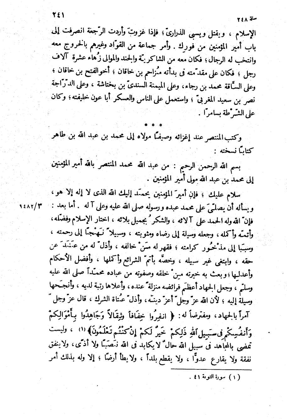فإن الله وله الحمد على آلائه، والشكر بجميل بلائه، اختار الإسلام وفضله، وأتمه وأكمله، وجعله وسيلة إلى رضاه ومثوبته، وسبيلا نهجا إلى رحمته، وسببا إلى مذخور كرامته، فقهر له من خالفه، وأذل له من عند عن حقه، وابتغى غير سبيله، وخصه بأتم الشرائع وأكملها، وأفضل الأحكام وأعدلها، وبعث به خيرته من خلقه وصفوته من عباده محمدا صلى الله عليه وسلم، وجعل الجهاد أعظم فرائضه منزلة عنده، وأعلاها رتبة لديه، وأنجحها وسيلة إليه، لأن الله عز وجل أعز دينه، وأذل عتاة الشرك، قال عز وجل أمرا بالجهاد، ومفترضا له: «انْفِرُوا خِفافاً وَثِقالًا وَجاهِدُوا بِأَمْوالِكُمْ وَأَنْفُسِكُمْ فِي سَبِيلِ اللَّهِ ذلِكُمْ خَيْرٌ لَكُمْ إِنْ كُنْتُمْ تَعْلَمُونَ» ، وليست تمضي بالمجاهد في سبيل الله حال لا يكابد في الله نصبا ولا أذى، ولا ينفق نفقة ولا يقارع عدوا، ولا يقطع بلدا، ولا يطأ أرضا، إلا وله بذلك امر