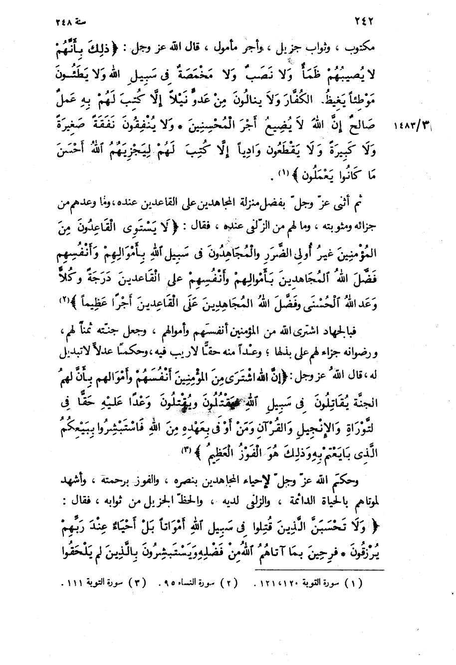 » ثم أثنى عز وجل بفضل منزلة المجاهدين على القاعدين عنده، وما وعدهم من جزائه ومثوبته، وما لهم من الزلفى عنده، فقال: «لا يَسْتَوِي الْقاعِدُونَ مِنَ الْمُؤْمِنِينَ غَيْرُ أُولِي الضَّرَرِ وَالْمُجاهِدُونَ فِي سَبِيلِ اللَّهِ بِأَمْوالِهِمْ وَأَنْفُسِهِمْ فَضَّلَ اللَّهُ الْمُجاهِدِينَ بِأَمْوالِهِمْ وَأَنْفُسِهِمْ عَلَى الْقاعِدِينَ دَرَجَةً وَكُلًّا وَعَدَ اللَّهُ الْحُسْنى وَفَضَّلَ اللَّهُ الْمُجاهِدِينَ عَلَى الْقاعِدِينَ أَجْراً عَظِيماً» فبالجهاد اشترى الله من المؤمنين أنفسهم وأموالهم، وجعل جنته ثمنا لهم، ورضوانه جزاء لهم على بذلها، وعدا منه حقا لا ريب فيه، وحكما عدلا لا تبديل له، قال الله عز وجل: «إِنَّ اللَّهَ اشْتَرى مِنَ الْمُؤْمِنِينَ أَنْفُسَهُمْ وَأَمْوالَهُمْ بِأَنَّ لَهُمُ الْجَنَّةَ يُقاتِلُونَ فِي سَبِيلِ اللَّهِ فَيَقْتُلُونَ وَيُقْتَلُونَ وَعْداً عَلَيْهِ حَقًّا فِي التَّوْراةِ وَالْإِنْجِيلِ وَالْقُرْآنِ وَمَنْ أَوْفى بِعَهْدِهِ مِنَ اللَّهِ فَاسْتَبْشِرُوا بِبَيْعِكُمُ الَّذِي بايَعْتُمْ بِهِ وَذلِكَ هُوَ الْفَوْزُ الْعَظِيمُ» وحكم الله عز وجل لإحياء المجاهدين بنصره، والفوز برحمته، وأشهد لموتاهم بالحياة الدائمة، والزلفى لديه، والحظ الجزيل من ثوابه، فقال: