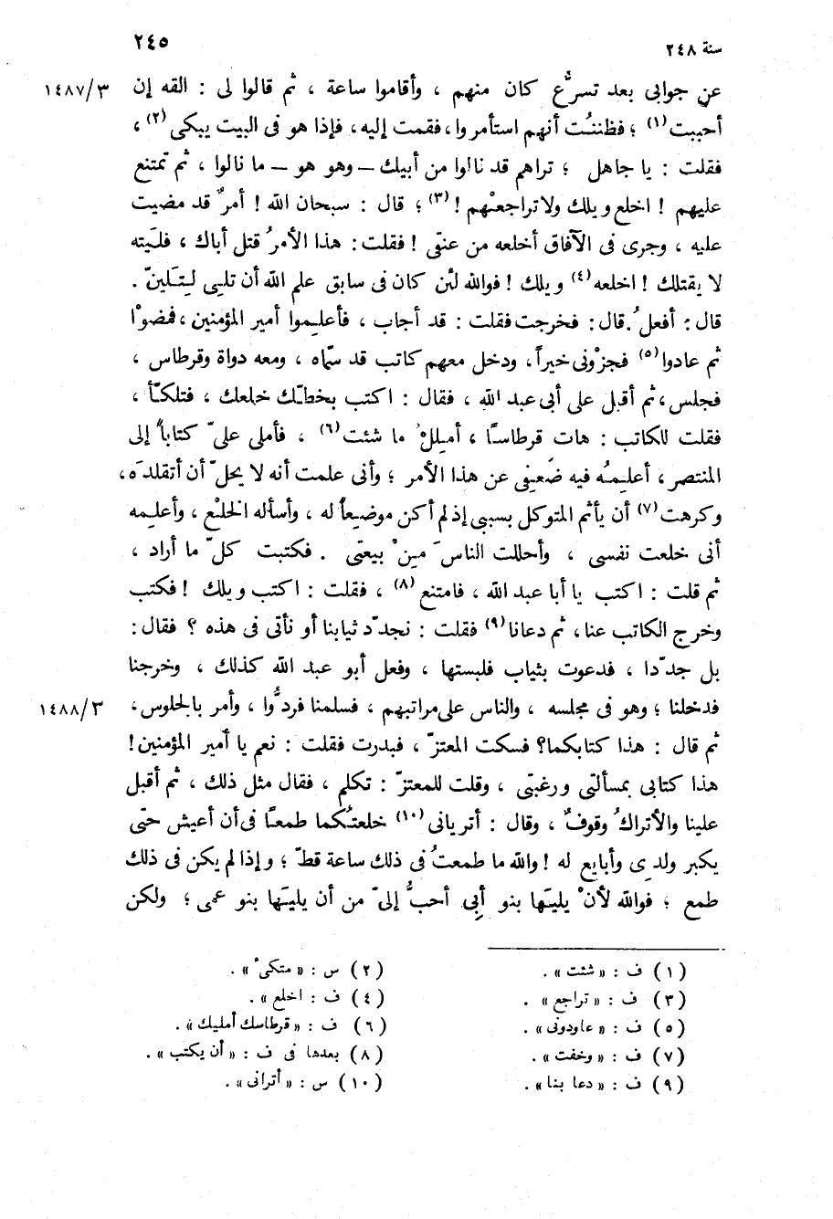قال: أفعل قال: فخرجت فقلت: قد أجاب، فأعلموا أمير المؤمنين، فمضوا ثم عادوا فجزوني خيرا، ودخل معهم كاتب قد سماه، ومعه دواة وقرطاس، فجلس، ثم أقبل على أبي عبد الله، فقال: اكتب بخطك خلعك، فتلكأ، فقلت للكاتب: هات قرطاسا، أملل ما شئت، فأملى علي كتابا إلى المنتصر، أعلمه فيه ضعفي عن هذا الأمر، وأني علمت أنه لا يحل أن أتقلده، وكرهت أن يأثم المتوكل بسببي إذ لم أكن موضعا له، وأسأله الخلع، وأعلمه أني خلعت نفسي، وأحللت الناس من بيعتي فكتبت كل ما أراد، ثم قلت: اكتب يا أبا عبد الله، فامتنع، فقلت: اكتب ويلك! فكتب وخرج الكاتب عنا، ثم دعانا فقلت: نجدد ثيابنا أو نأتي في هذه؟ فقال: