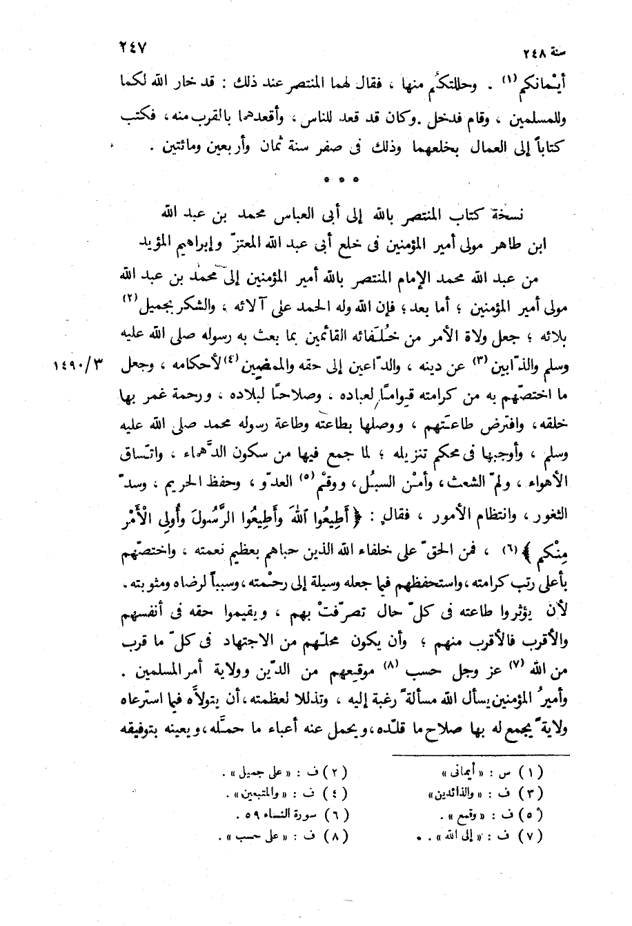 ابن طاهر مولى أمير المؤمنين في خلع أبي عبد الله المعتز وإبراهيم المؤيد من عبد الله محمد الإمام المنتصر بالله أمير المؤمنين إلى محمد بْن عبد الله مولى أمير المؤمنين، أما بعد، فإن الله وله الحمد على آلائه، والشكر بجميل بلائه، جعل ولاة الأمر من خلفائه القائمين بما بعث به رسوله ص والذابين عن دينه، والداعين إلى حقه والممضين لأحكامه، وجعل ما اختصهم به من كرامته قواما لعباده، وصلاحا لبلاده، ورحمه غمر بها خلقه وافترض طاعتهم، ووصلها بطاعته وطاعة رسوله محمد صلى الله عليه وسلم، وأوجبها في محكم تنزيله، لما جمع فيها من سكون الدهماء، واتساق الأهواء، ولم الشعث، وأمن السبل، ووقم العدو، وحفظ الحريم، وسد الثغور، وانتظام الأمور، فقال: «أَطِيعُوا اللَّهَ وَأَطِيعُوا الرَّسُولَ وَأُولِي الْأَمْرِ مِنْكُمْ» ، فمن الحق على خلفاء الله الذين حباهم بعظيم نعمته، واختصهم بأعلى رتب كرامته، واستحفظهم فيما جعله وسيلة إلى رحمته، وسببا لرضاه ومثوبته، لأن يؤثروا طاعته في كل حال تصرفت بهم، ويقيموا حقه في أنفسهم والأقرب فالأقرب منهم، وأن يكون محلهم من الاجتهاد في كل ما قرب من الله عز وجل حسب موقعهم من الدين وولاية أمر المسلمين.