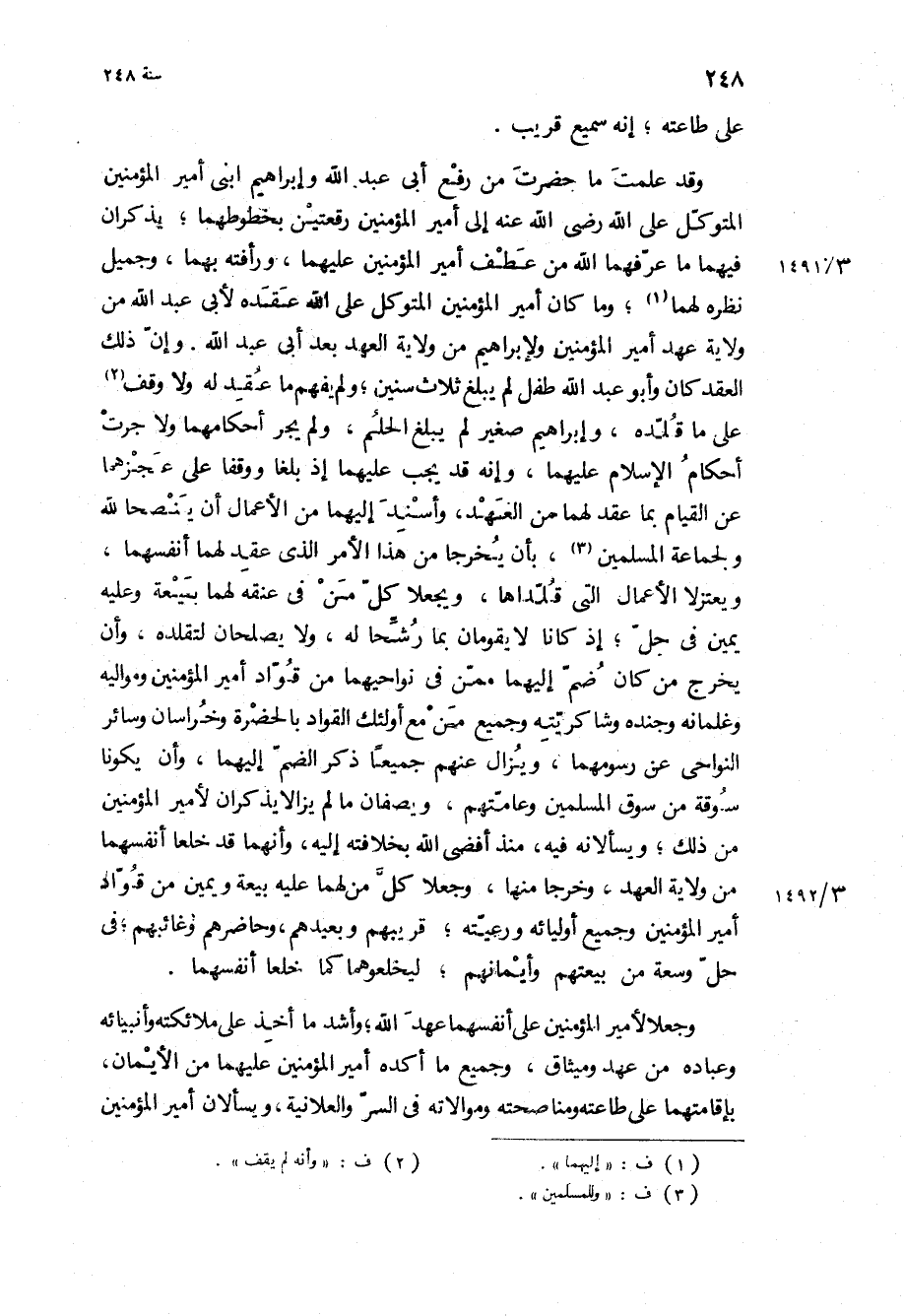 وقد علمت ما حضرت من رفع أبي عبد الله وإبراهيم ابني أمير المؤمنين المتوكل على الله رضي الله عنه إلى أمير المؤمنين رقعتين بخطوطهما، يذكران فيهما ما عرفهما الله من عطف أمير المؤمنين عليهما، ورأفته بهما، وجميل نظره لهما، وما كان أمير المؤمنين المتوكل على الله عقده لأبي عبد الله من ولاية عهد أمير المؤمنين ولإبراهيم من ولاية العهد بعد أبي عبد الله وإن ذلك العقد كان وأبو عبد الله طفل لم يبلغ ثلاث سنين، ولم يفهم ما عقد له ولا وقف على ما قلده، وإبراهيم صغير لم يبلغ الحلم، ولم يجر أحكامهما ولا جرت أحكام الإسلام عليهما، وإنه قد يجب عليهما إذ بلغا ووقفا على عجزهما عن القيام بما عقد لهما من العهد، وأسند إليهما من الأعمال أن ينصحا لله ولجماعة المسلمين، بأن يخرجا من هذا الأمر الذي عقد لهما أنفسهما، ويعتزلا الأعمال التي قلداها، ويجعلا كل من في عنقه لهما بيعة وعليه يمين في حل، إذ كانا لا يقومان بما رشحا له، ولا يصلحان لتقلده، وأن يخرج من كان ضم إليهما ممن في نواحيهما من قواد أمير المؤمنين ومواليه وغلمانه وجنده وشاكريته وجميع من مع أولئك القواد بالحضرة وخراسان وسائر النواحي عن رسومهما، ويزال عنهم جميعا ذكر الضم إليهما، وأن يكونا سوقة من سوق المسلمين وعامتهم، ويصفان ما لم يزالا يذكران لأمير المؤمنين من ذلك، ويسألانه فيه، منذ أفضى الله بخلافته إليه، وانهما قد خلعا أنفسهما من ولاية العهد، وخرجا منها، وجعلا كل من لهما عليه بيعة ويمين من قواد أمير المؤمنين وجميع أوليائه ورعيته، قريبهم وبعيدهم، وحاضرهم وغائبهم، في حل وسعة من بيعتهم وأيمانهم، ليخلعوهما كما خلعا أنفسهما.