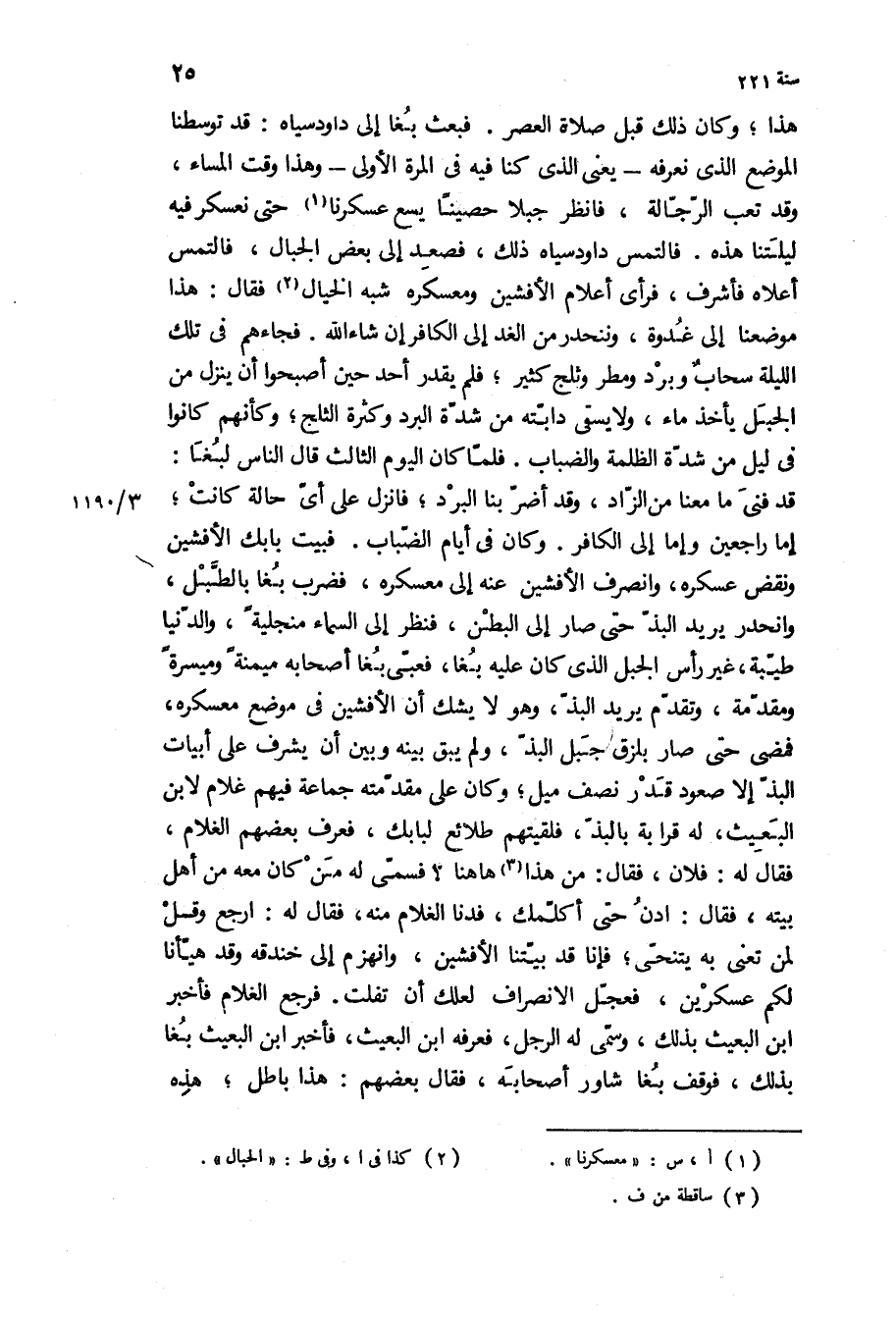 قد فني ما معنا من الزاد، وقد اضربنا البرد، فانزل على أي حالة كانت، إما راجعين وإما إلى الكافر وكان في أيام الضباب فبيت بابك الافشين ونقض عسكره، وانصرف الأفشين عنه إلى معسكره، فضرب بغا بالطبل، وانحدر يريد البذ حتى صار إلى البطن، فنظر إلى السماء منجلية، والدنيا طيبة، غير رأس الجبل الذي كان عليه بغا، فعبى بغا أصحابه ميمنة وميسرة ومقدمة، وتقدم يريد البذ، وهو لا يشك أن الأفشين في موضع معسكره، فمضى حتى صار بلزق جبل البذ، ولم يبق بينه وبين ان يشرف على ابيات البذ إلا صعود قدر نصف ميل، وكان على مقدمته جماعة فيهم غلام لابن البعيث، له قرابة بالبذ، فلقيتهم طلائع لبابك، فعرف بعضهم الغلام، فقال له: فلان، فقال: من هذا هاهنا؟ فسمي له من كان معه من أهل بيته، فقال: ادن حتى أكلمك، فدنا الغلام منه، فقال له: ارجع وقل لمن تعني به يتنحى، فإنا قد بيتنا الأفشين، وانهزم إلى خندقه وقد هيأنا لكم عسكرين، فعجل الانصراف لعلك أن تفلت فرجع الغلام فأخبر ابن البعيث بذلك، وسمي له الرجل، فعرفه ابن البعيث، فأخبر ابن البعيث بغا بذلك، فوقف بغا شاور أصحابه، فقال بعضهم: هذا باطل، هذه