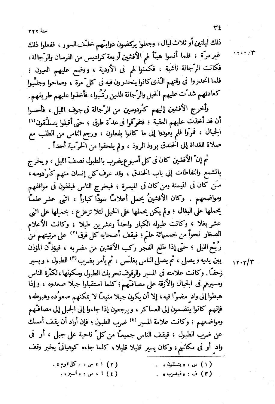 ثم إن الأفشين كان في كل أسبوع يضرب بالطبول نصف الليل، ويخرج بالشمع والنفاطات إلى باب الخندق، وقد عرف كل إنسان منهم كردوسه، من كان في الميمنة ومن كان في الميسرة، فيخرج الناس فيقفون في مواقفهم ومواضعهم وكان الأفشين يحمل أعلاما سودا كبارا، اثني عشر علما يحملها على البغال، ولم يكن يحملها على الخيل لئلا تزعزع، يحملها على اثنى عشر بغلا، وكانت طبوله الكبار واحدا وعشرين طبلا، وكانت الأعلام الصغار نحوا من خمسمائة علم، فيقف أصحابه كل فرق على مرتبتهم من ربع الليل، حتى إذا طلع الفجر ركب الأفشين من مضربه، فيؤذن المؤذن بين يديه ويصلي، ثم يصلي الناس بغلس، ثم يأمر بضرب الطبول، ويسير زحفا وكانت علامته في المسير والوقوف تحريك الطبول وسكونها، لكثرة الناس ومسيرهم في الجبال والأزقة على مصافهم، كلما استقبلوا جبلا صعدوه، وإذا هبطوا إلى واد مضوا فيه، إلا أن يكون جبلا منيعا لا يمكنهم صعوده وهبوطه، فإنهم كانوا ينضمون إلى العساكر، ويرجعون إذا جاءوا إلى الجبل إلى مصافهم ومواضعهم، وكانت علامة المسير ضرب الطبول، فان أراد أن يقف أمسك عن ضرب الطبول، فيقف الناس جميعا من كل ناحية على جبل، أو في واد أو في مكانهم، وكان يسير قليلا قليلا، كلما جاءه كوهباني بخبر وقف