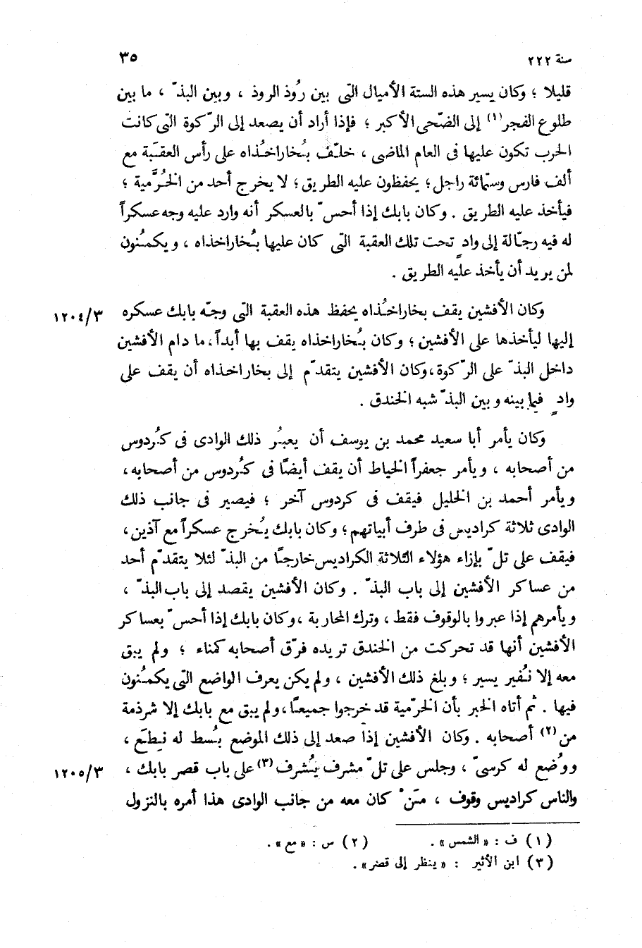 قليلا، وكان يسير هذه الستة الأميال التي بين روذ الروذ، وبين البذ، ما بين طلوع الفجر إلى الضحى الأكبر، فإذا أراد أن يصعد إلى الركوة التي كانت الحرب تكون عليها في العام الماضى، خلف بخاراخذاه على راس العقبه مع الف فارس وستمائه راجل، يحفظون عليه الطريق، لا يخرج أحد من الخرمية، فيأخذ عليه الطريق وكان بابك إذا أحس بالعسكر أنه وارد عليه وجه عسكرا له فيه رجالة إلى واد تحت تلك العقبة التي كان عليها بخاراخذاه، ويكمنون لمن يريد ان يأخذ عليه الطريق سنه 222 وكان الافشين يقف بخارا خذاه يحفظ هذه العقبة التي وجه بابك عسكره إليها ليأخذها على الأفشين، وكان بخاراخذاه يقف بها أبدا، ما دام الأفشين داخل البذ على الركوة، وكان الأفشين يتقدم إلى بخاراخذاه أن يقف على واد فيما بينه وبين البذ شبه الخندق.