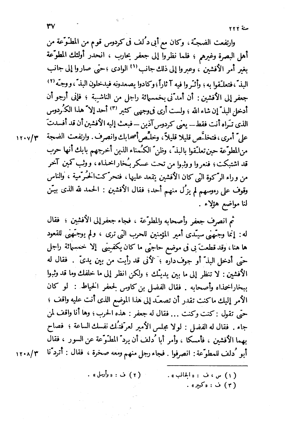وارتفعت الضجة، وكان مع أبي دلف في كردوس قوم من المطوعة من أهل البصرة وغيرهم، فلما نظروا إلى جعفر يحارب، انحدر أولئك المطوعة بغير أمر الأفشين، وعبروا إلى ذلك جانب الوادي، حتى صاروا إلى جانب البذ، فتعلقوا به، وأثروا فيه آثارا، وكادوا يصعدونه فيدخلون البذ، ووجه جعفر إلى الأفشين: ان امدنى بخمسمائة راجل من الناشبة، فإني أرجو أن أدخل البذ إن شاء الله، ولست أرى في وجهي كثير أحد إلا هذا الكردوس الذي تراه أنت فقط- يعني كردوس آذين- فبعث إليه الأفشين أن قد أفسدت علي أمري، فتخلص قليلا قليلا، وخلص أصحابك وانصرف وارتفعت الضجة من المطوعة حين تعلقوا بالبذ، وظن الكمناء الذين أخرجهم بابك أنها حرب قد اشتبكت، فنعروا ووثبوا من تحت عسكر بخاراخذاه، ووثب كمين آخر من وراء الركوة التي كان الأفشين يقعد عليها، فتحركت الخرمية، والناس وقوف على رءوسهم لم يزل منهم أحد، فقال الأفشين: الحمد لله الذي بين لنا مواضع هؤلاء.
