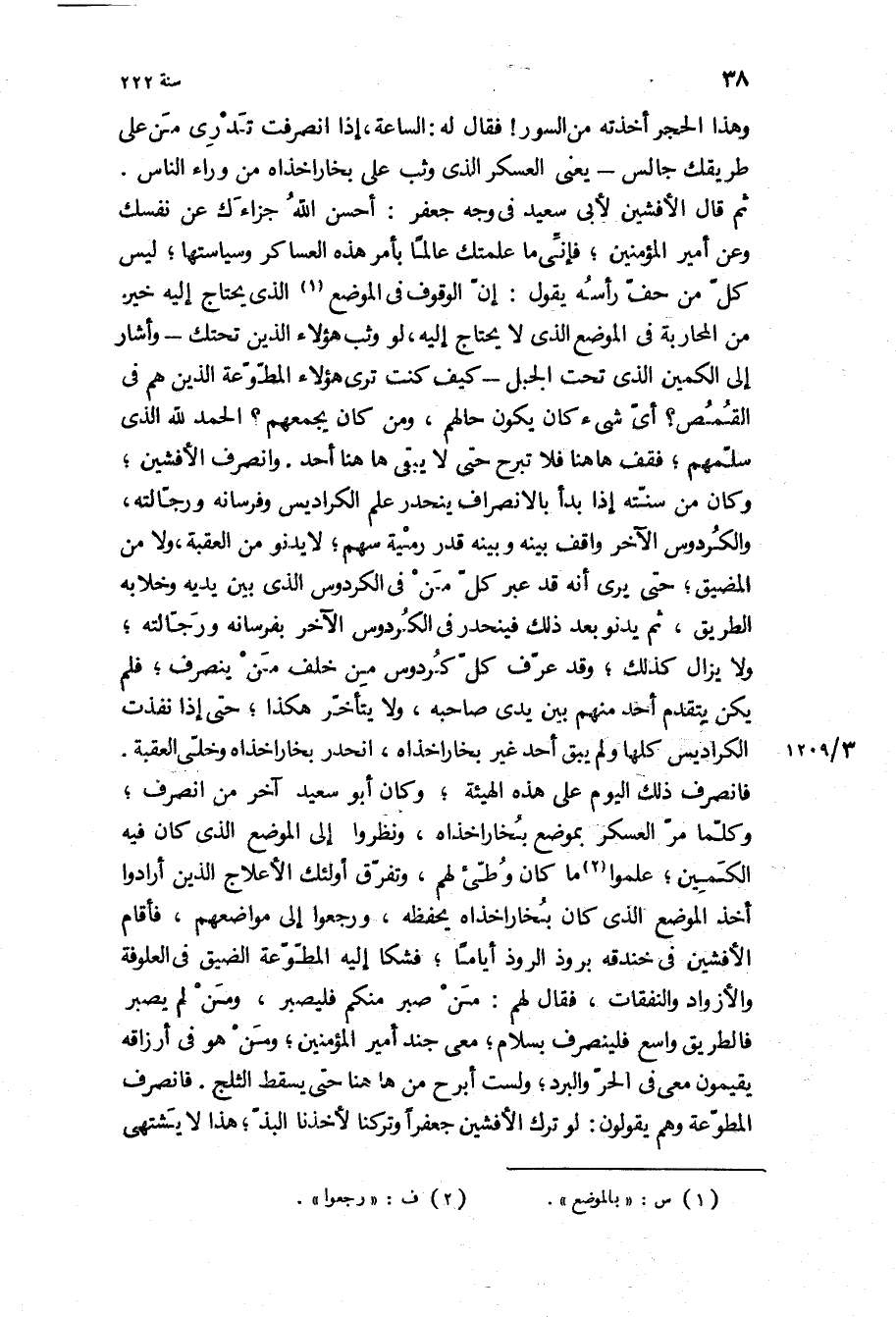 من المحاربة في الموضع الذي لا يحتاج إليه، لو وثب هؤلاء الذين تحتك- وأشار إلى الكمين الذي تحت الجبل- كيف كنت ترى هؤلاء المطوعة الذين هم في القمص؟ أي شيء كان يكون حالهم، ومن كان يجمعهم؟ الحمد لله الذي سلمهم، فقف هاهنا فلا تبرح حتى لا يبقى هاهنا أحد وانصرف الأفشين، وكان من سنته إذا بدا بالانصراف ينحدر علم الكراديس وفرسانه ورجالته، والكردوس الآخر واقف بينه وبينه قدر رمية سهم، لا يدنو من العقبة، ولا من المضيق، حتى يرى أنه قد عبر كل من في الكردوس الذي بين يديه وخلا به الطريق، ثم يدنو بعد ذلك فينحدر في الكردوس الآخر بفرسانه ورجالته، ولا يزال كذلك، وقد عرف كل كردوس من خلف من ينصرف، فلم يكن يتقدم أحد منهم بين يدي صاحبه، ولا يتأخر هكذا، حتى إذا نفذت الكراديس كلها ولم يبق أحد غير بخاراخذاه، انحدر بخاراخذاه وخلى العقبة.
