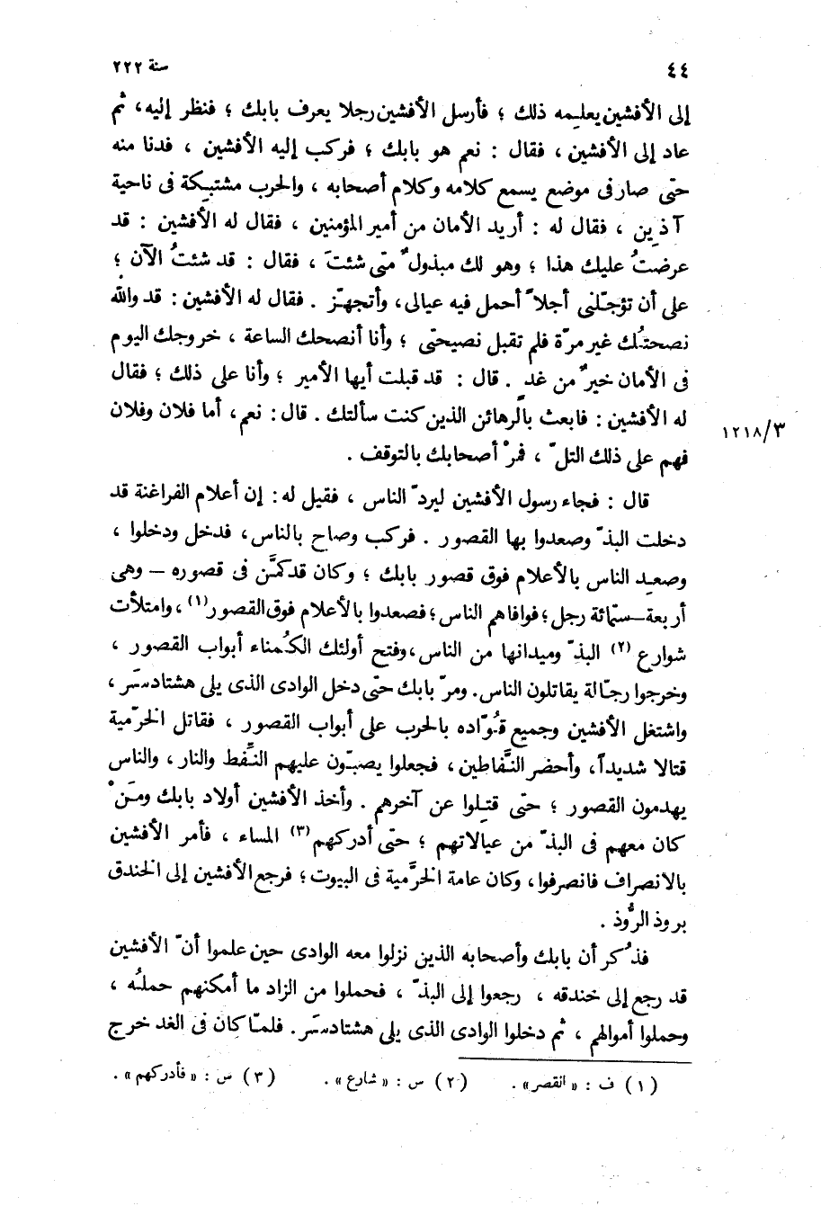 قال: فجاء رسول الأفشين ليرد الناس، فقيل له: إن أعلام الفراغنة قد دخلت البذ وصعدوا بها القصور فركب وصاح بالناس، فدخل ودخلوا، وصعد الناس بالأعلام فوق قصور بابك، وكان قد كمن في قصوره- وهي اربعه- ستمائه رجل، فوافاهم الناس، فصعدوا بالأعلام فوق القصور، وامتلأت شوارع البذ وميدانها من الناس، وفتح أولئك الكمناء أبواب القصور، وخرجوا رجالة يقاتلون الناس ومر بابك حتى دخل الوادي الذي يلى هشتاد سر، واشتغل الأفشين وجميع قواده بالحرب على أبواب القصور، فقاتل الخرمية قتالا شديدا، وأحضر النفاطين، فجعلوا يصبون عليهم النفط والنار، والناس يهدمون القصور، حتى قتلوا عن آخرهم وأخذ الأفشين أولاد بابك ومن كان معهم في البذ من عيالاتهم، حتى أدركهم المساء، فأمر الأفشين بالانصراف فانصرفوا، وكان عامة الخرمية في البيوت، فرجع الأفشين إلى الخندق بروذ الروذ.