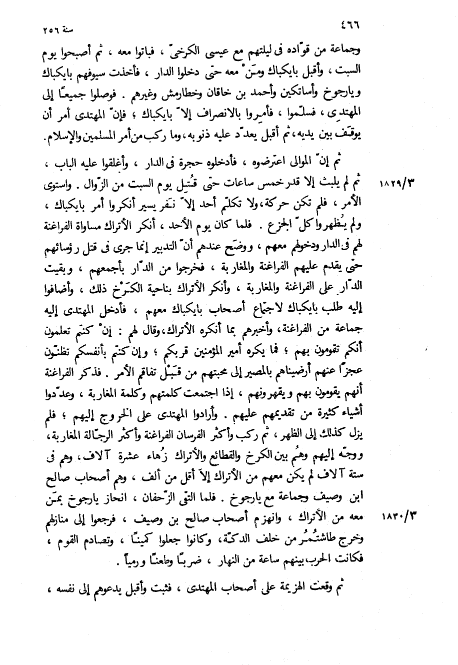 ثم إن الموالي اعترضوه، فأدخلوه حجرة في الدار، وأغلقوا عليه الباب، ثم لم يلبث إلا قدر خمس ساعات حتى قتل يوم السبت من الزوال واستوى الأمر، فلم تكن حركة، ولا تكلم أحد إلا نفر يسير أنكروا أمر بايكباك، ولم يظهروا كل الجزع فلما كان يوم الأحد، أنكر الأتراك مساواة الفراغنة لهم في الدار ودخولهم معهم، ووضح عندهم أن التدبير إنما جرى في قتل رؤسائهم حتى يقدم عليهم الفراغنة والمغاربة، فخرجوا من الدار بأجمعهم، وبقيت الدار على الفراغنة والمغاربة، وأنكر الأتراك بناحية الكرخ ذلك، وأضافوا إليه طلب بايكباك لاجتماع أصحاب بايكباك معهم، فأدخل المهتدي إليه جماعة من الفراغنة، وأخبرهم بما أنكره الأتراك، وقال لهم: إن كنتم تعلمون أنكم تقومون بهم، فما يكره أمير المؤمنين قربكم، وإن كنتم بأنفسكم تظنون عجزا عنهم أرضيناهم بالمصير إلى محبتهم من قبل تفاقم الأمر فذكر الفراغنة أنهم يقومون بهم ويقهرونهم، إذا اجتمعت كلمتهم وكلمة المغاربة، وعددوا أشياء كثيرة من تقديمهم عليهم وأرادوا المهتدي على الخروج إليهم، فلم يزل كذلك إلى الظهر، ثم ركب وأكثر الفرسان الفراغنة وأكثر الرجالة المغاربة، ووجه إليهم وهم بين الكرخ والقطائع والأتراك زهاء عشرة آلاف، وهم في ستة آلاف لم يكن معهم من الأتراك إلا اقل من الف، وهم اصحاب صالح ابن وصيف وجماعة مع يارجوخ فلما التقى الزحفان، انحاز يارجوخ بمن معه من الأتراك، وانهزم أصحاب صالح بن وصيف، فرجعوا إلى منازلهم وخرج طاشتمر من خلف الدكة، وكانوا جعلوا كمينا، وتصادم القوم، فكانت الحرب بينهم ساعة من النهار، ضربا وطعنا ورميا.