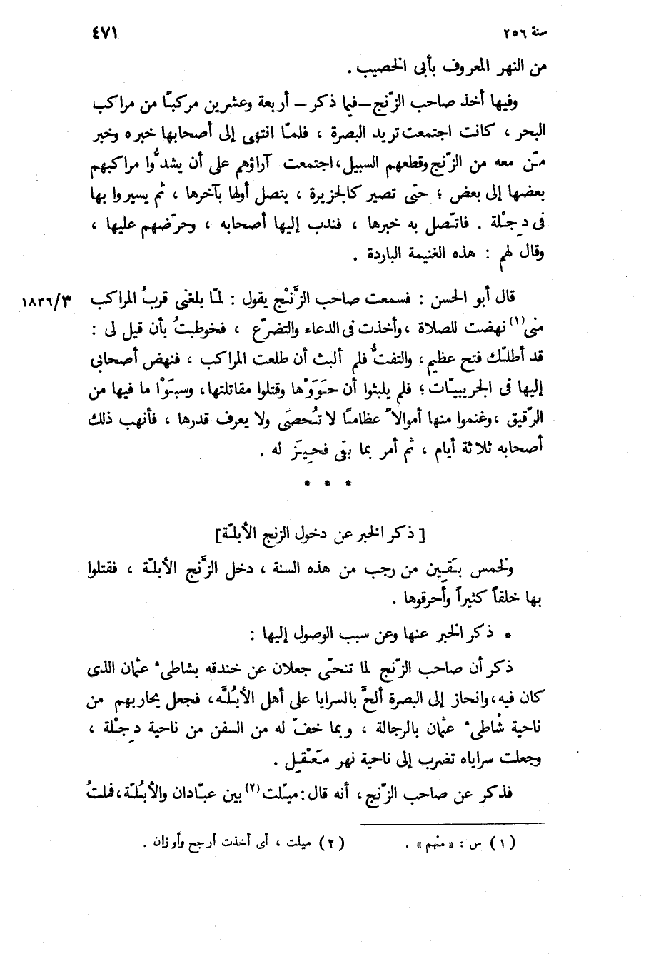 ولخمس بقين من رجب من هذه السنة، دخل الزنج الأبلة، فقتلوا بها خلقا كثيرا وأحرقوها.