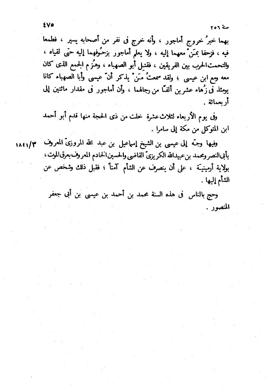 وفيها وجه إلى عيسى بن الشيخ إسماعيل بن عبد الله المروزي المعروف بأبي النصر ومحمد بن عبيد الله الكريزي القاضي والحسين الخادم المعروف بعرق الموت، بولاية أرمينية، على أن ينصرف عن الشام آمنا، فقبل ذلك وشخص عن الشام إليها.