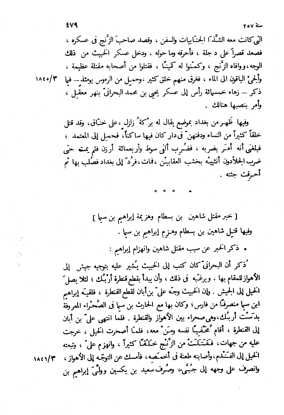 ذكر الخبر عن سبب مقتل شاهين وانهزام إبراهيم: ذكر أن البحراني كان كتب إلى الخبيث يشير عليه بتوجيه جيش إلى الأهواز للمقام بها، ويرغبه في ذلك، وأن يبدأ بقطع قنطرة أربك، لئلا يصل الخيل إلى الجيش وإن الخبيث وجه علي بن ابان لقطع القنطرة، فلقيه ابراهيم ابن سيما منصرفا من فارس، وكان بها مع الحارث بن سيما في الصحراء المعروفة بدست اربك، وهي صحراء بين الأهواز والقنطرة فلما انتهى علي بن أبان إلى القنطرة، أقام مخفيا نفسه ومن معه، فلما أصحرت الخيل، خرجت عليه من جهات، فقتلت من الزنج خلقا كثيرا، وانهزم علي، وتبعته الخيل إلى الفندم، وأصابته طعنة في أخمصه، فأمسك عن التوجه إلى الأهواز، وانصرف على وجهه إلى جبى، وصرف سعيد بن يكسين وولي إبراهيم بن