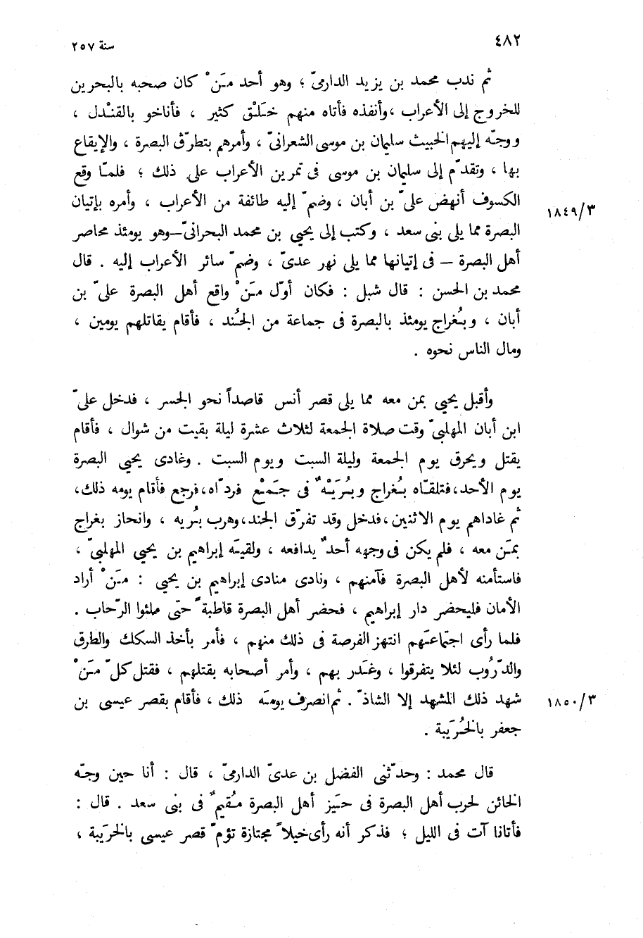 ثم ندب محمد بن يزيد الدارمي، وهو أحد من كان صحبه بالبحرين للخروج إلى الأعراب، وأنفذه فأتاه منهم خلق كثير، فأناخوا بالقندل، ووجه إليهم الخبيث سليمان بن موسى الشعراني، وأمرهم بتطرق البصرة، والإيقاع بها، وتقدم إلى سليمان بن موسى في تمرين الأعراب على ذلك، فلما وقع الكسوف أنهض علي بن أبان، وضم إليه طائفة من الأعراب، وأمره بإتيان البصرة مما يلي بني سعد، وكتب إلى يحيى بن محمد البحراني- وهو يومئذ محاصر أهل البصرة- في إتيانها مما يلي نهر عدي، وضم سائر الأعراب إليه قال محمد بن الحسن: قال شبل: فكان أول من واقع أهل البصرة علي بن أبان، وبغراج يومئذ بالبصرة في جماعة من الجند، فأقام يقاتلهم يومين، ومال الناس نحوه.