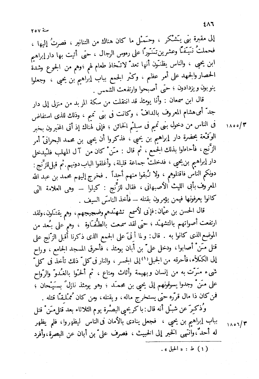 إلى مقبره بني يشكر، وحمل ما كان هناك من التنانير، فصرت إليها، فحملت نيفا وعشرين تنورا على رءوس الرجال، حتى أتيت بها دار ابراهيم ابن يحيى، والناس يظنون أنها تعد لاتخاذ طعام لهم، وهم من الجوع وشدة الحصار والجهد على أمر عظيم، وكثر الجمع بباب إبراهيم بن يحيى، وجعلوا ينوبون ويزدادون، حتى أصبحوا وارتفعت الشمس.