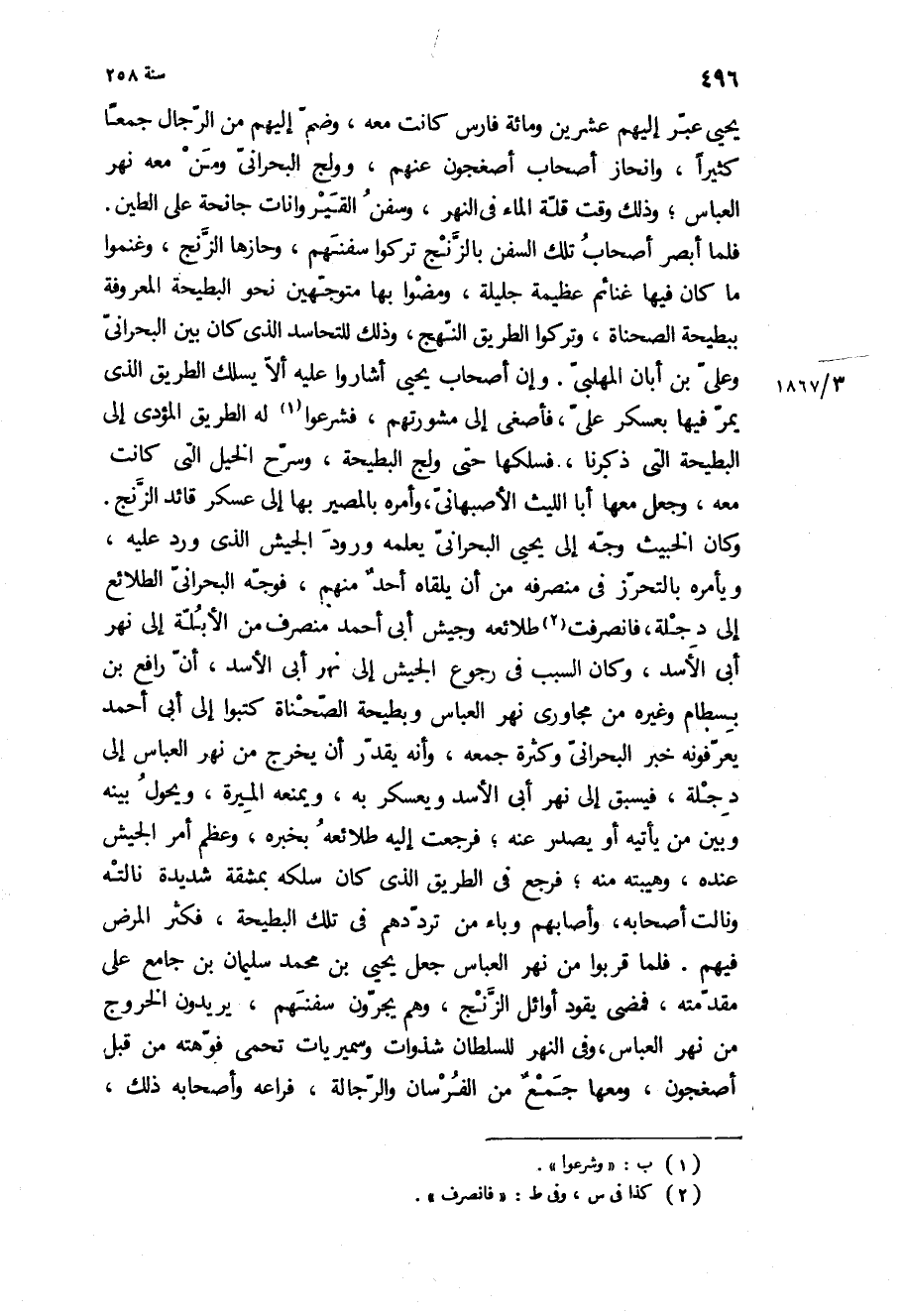 فلما أبصر أصحاب تلك السفن بالزنج تركوا سفنهم، وحازها الزنج، وغنموا ما كان فيها غنائم عظيمة جليلة، ومضوا بها متوجهين نحو البطيحة المعروفة ببطيحة الصحناة، وتركوا الطريق النهج، وذلك للتحاسد الذي كان بين البحراني وعلي بن أبان المهلبي وإن أصحاب يحيى أشاروا عليه ألا يسلك الطريق الذي يمر فيها بعسكر علي، فأصغى إلى مشورتهم، فشرعوا له الطريق المؤدي إلى البطيحة التي ذكرنا، فسلكها حتى ولج البطيحة، وسرح الخيل التي كانت معه، وجعل معها أبا الليث الأصبهاني، وأمره بالمصير بها إلى عسكر قائد الزنج.