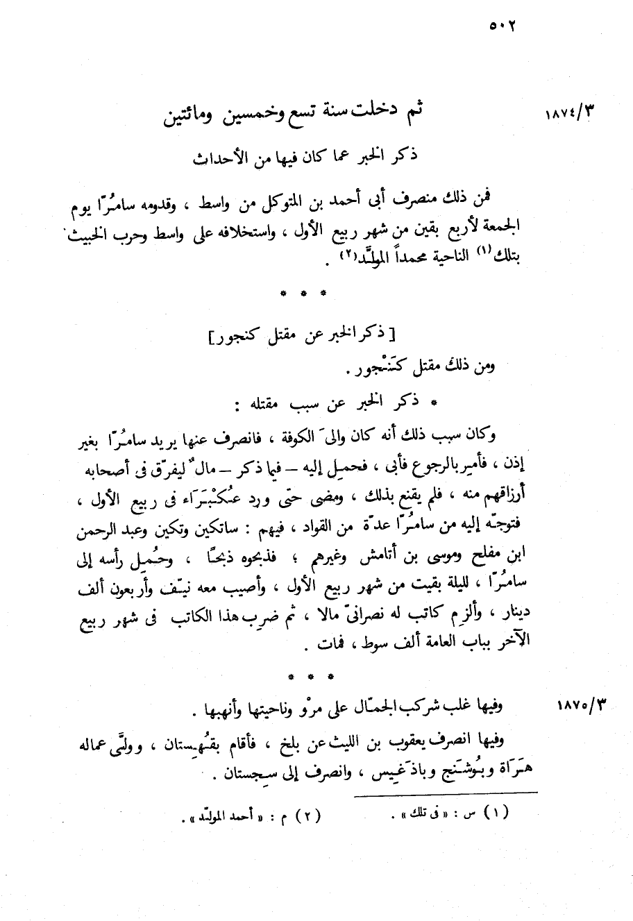 فمن ذلك منصرف أبي أحمد بن المتوكل من واسط، وقدومه سامرا يوم الجمعة لأربع بقين من شهر ربيع الأول، واستخلافه على واسط وحرب الخبيث بتلك الناحية محمدا المولد
