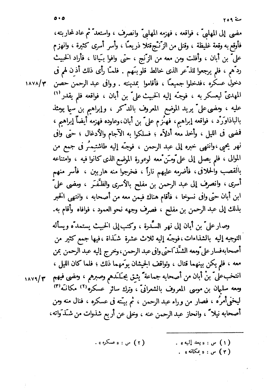 مضى إلى المهلبي، فواقعه، فهزمه المهلبي وانصرف، واستعد ثم عاد لمحاربته، فأوقع به وقعة غليظة، وقتل من الزنج قتلا ذريعا، وأسر أسرى كثيرة، وانهزم علي بن أبان، وأفلت ومن معه من الزنج، حتى وافوا بيانا، فأراد الخبيث ردهم، فلم يرجعوا للذعر الذي خالط قلوبهم فلما رأى ذلك أذن لهم في دخول عسكره، فدخلوا جميعا، فأقاموا بمدينته ووافى عبد الرحمن حصن المهدي ليعسكر به، فوجه إليه الخبيث علي بن أبان، فواقعه فلم يقدر عليه، ومضى علي يريد الموضع المعروف بالدكر، وإبراهيم بن سيما يومئذ بالباذاورد، فواقعه إبراهيم، فهزم علي بن أبان، وعاوده فهزمه أيضا إبراهيم، فمضى في الليل، وأخذ معه أدلاء، فسلكوا به الآجام والأدغال، حتى وافى نهر يحيى، وانتهى خبره إلى عبد الرحمن، فوجه إليه طاشتمر في جمع من الموالي، فلم يصل إلى علي ومن معه لوعورة الموضع الذي كانوا فيه، وامتناعه بالقصب والحلافي، فأضرمه عليهم نارا، فخرجوا منه هاربين، فأسر منهم أسرى، وانصرف إلى عبد الرحمن بن مفلح بالأسرى والظفر، ومضى على ابن أبان حتى وافى نسوخا، فأقام هناك فيمن معه من أصحابه، وانتهى الخبر بذلك إلى عبد الرحمن بن مفلح، فصرف وجهه نحو العمود، فوافاه وأقام به.