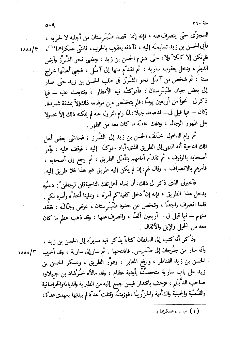 ثم رام الدخول خلف الحسن بن زيد إلى الشرز، فحدثني بعض أهل تلك الناحية أنه انتهى إلى الطريق الذي أراد سلوكه إليه، فوقف عليه، وأمر أصحابه بالوقوف، ثم تقدم أمامهم يتأمل الطريق، ثم رجع إلى أصحابه، فأمرهم بالانصراف، وقال لهم: إن لم يكن إليه طريق غير هذا فلا طريق إليه فأخبرني الذي ذكر لي ذلك، أن نساء أهل تلك الناحية قلن لرجالهن: دعوه يدخل هذا الطريق، فإنه إن دخل كفيناكم أمره، وعلينا أخذه وأسره لكم فلما انصرف راجعا، وشخص عن حدود طبرستان، عرض رجاله، ففقد منهم- فيما قيل لي- أربعين ألفا، وانصرف عنها، وقد ذهب عظم ما كان معه من الخيل والإبل والأثقال وذكر أنه كتب إلى السلطان كتابا يذكر فيه مسيره إلى الحسن بن زيد، وأنه سار من جرجان إلى طميس فافتتحها ثم سار إلى سارية، وقد أخرب الحسن بن زيد القناطر، ورفع المعابر، وعور الطريق، وعسكر الحسن بن زيد على باب سارية متحصنا بأودية عظام، وقد مالاه خرشاد بن جيلاو، صاحب الديلم، فزحف باقتدار فيمن جمع إليه من الطبرية والديالمة والخراسانيه والقمية والجبلية والشامية والجزرية، فهزمته وقتلت عدة لم يبلغها بعهدي عدة،