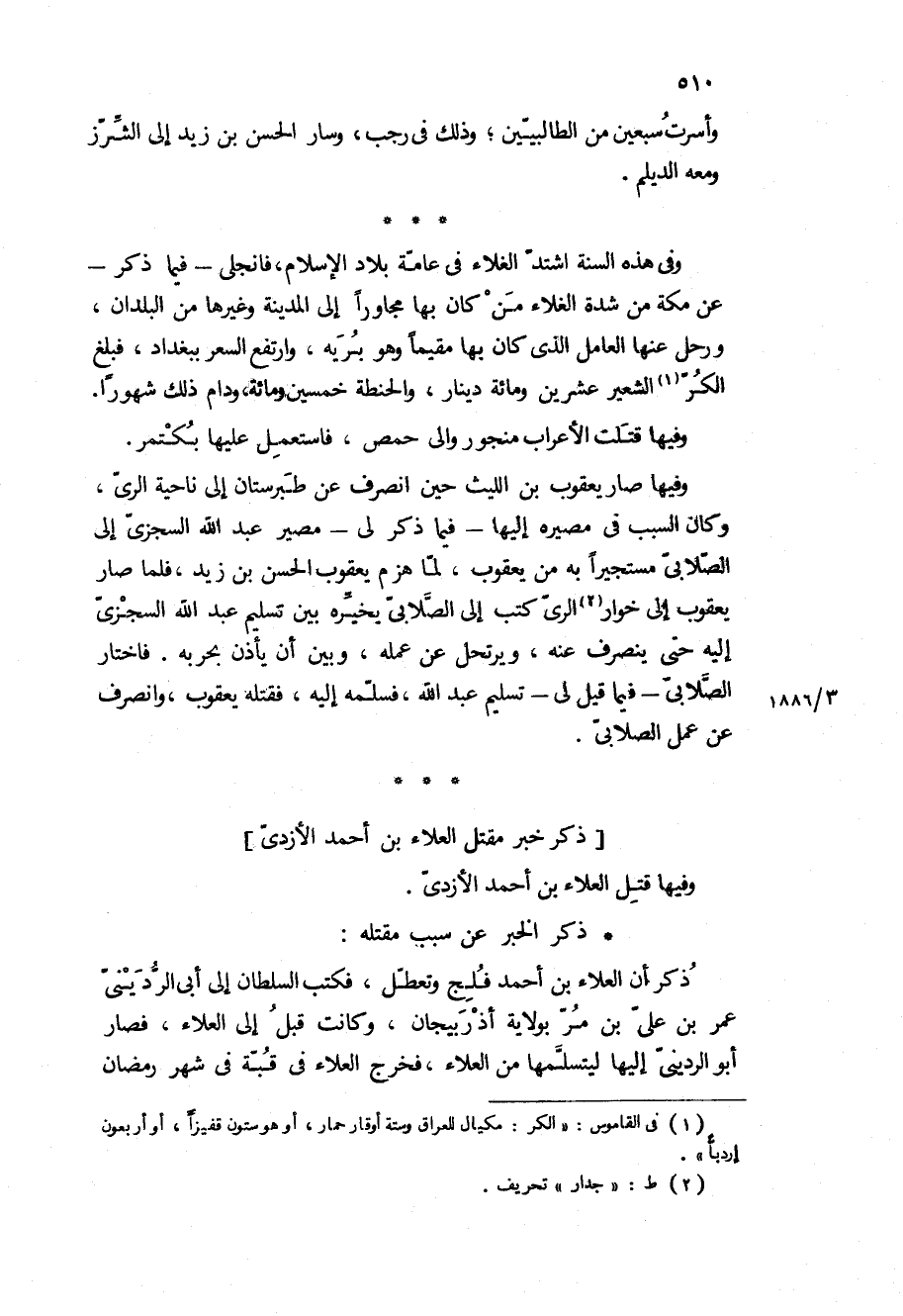 وأسرت سبعين من الطالبيين، وذلك في رجب، وسار الحسن بن زيد إلى الشرز ومعه الديلم وفي هذه السنة اشتد الغلاء في عامة بلاد الإسلام، فانجلى- فيما ذكر- عن مكة من شدة الغلاء من كان بها مجاورا إلى المدينة وغيرها من البلدان، ورحل عنها العامل الذي كان بها مقيما وهو بريه، وارتفع السعر ببغداد، فبلغ الكر الشعير عشرين ومائه دينار، والحنطة خمسين ومائه، ودام ذلك شهورا 4 وفيها قتلت الأعراب منجور والي حمص، فاستعمل عليها بكتمر وفيها صار يعقوب بن الليث حين انصرف عن طبرستان إلى ناحية الري، وكان السبب في مصيره إليها- فيما ذكر لي- مصير عبد الله السجزي إلى الصلابي مستجيرا به من يعقوب، لما هزم يعقوب الحسن بن زيد، فلما صار يعقوب الى خوار الري كتب إلى الصلابي يخيره بين تسليم عبد الله السجزي إليه.