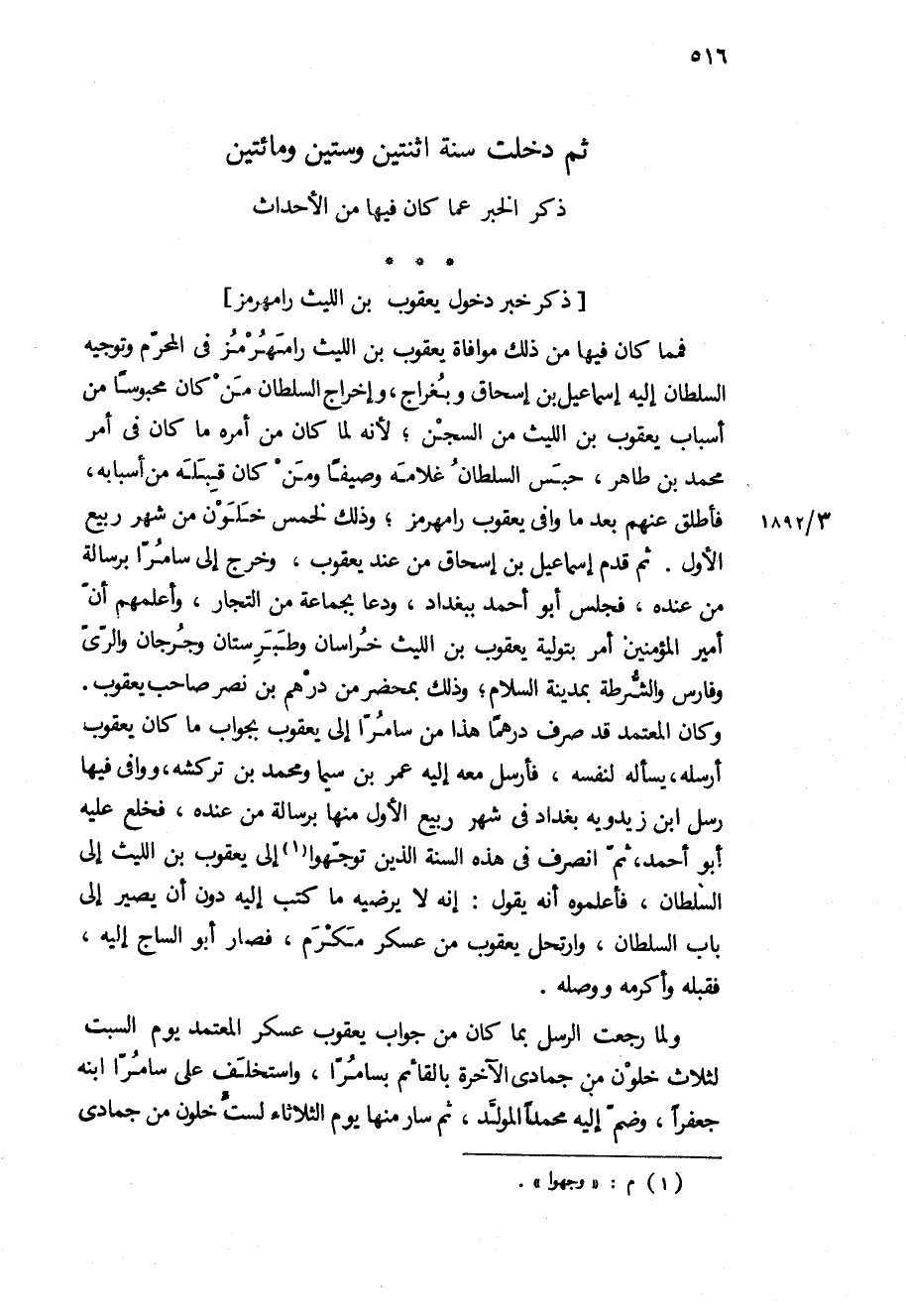 فمما كان فيها من ذلك موافاة يعقوب بن الليث رامهرمز في المحرم وتوجيه السلطان إليه إسماعيل بن إسحاق وبغراج، وإخراج السلطان من كان محبوسا من أسباب يعقوب بن الليث من السجن، لأنه لما كان من أمره ما كان في أمر محمد بن طاهر، حبس السلطان غلامه وصيفا ومن كان قبله من أسبابه، فاطلق عنهم بعد ما وافى يعقوب رامهرمز، وذلك لخمس خلون من شهر ربيع الأول ثم قدم إسماعيل بن إسحاق من عند يعقوب، وخرج إلى سامرا برسالة من عنده، فجلس أبو أحمد ببغداد، ودعا بجماعة من التجار، وأعلمهم أن أمير المؤمنين أمر بتولية يعقوب بن الليث خراسان وطبرستان وجرجان والري وفارس والشرطة بمدينة السلام، وذلك بمحضر من درهم بن نصر صاحب يعقوب وكان المعتمد قد صرف درهما هذا من سامرا إلى يعقوب بجواب ما كان يعقوب أرسله، يسأله لنفسه، فأرسل معه إليه عمر بن سيما ومحمد بن تركشة، ووافى فيها رسل ابن زيدويه بغداد في شهر ربيع الأول منها برسالة من عنده، فخلع عليه أبو أحمد، ثم انصرف في هذه السنة الذين توجهوا إلى يعقوب بن الليث إلى السلطان، فأعلموه أنه يقول: أنه لا يرضيه ما كتب إليه دون أن يصير إلى باب السلطان، وارتحل يعقوب من عسكر مكرم، فصار أبو الساج إليه، فقبله وأكرمه ووصله.