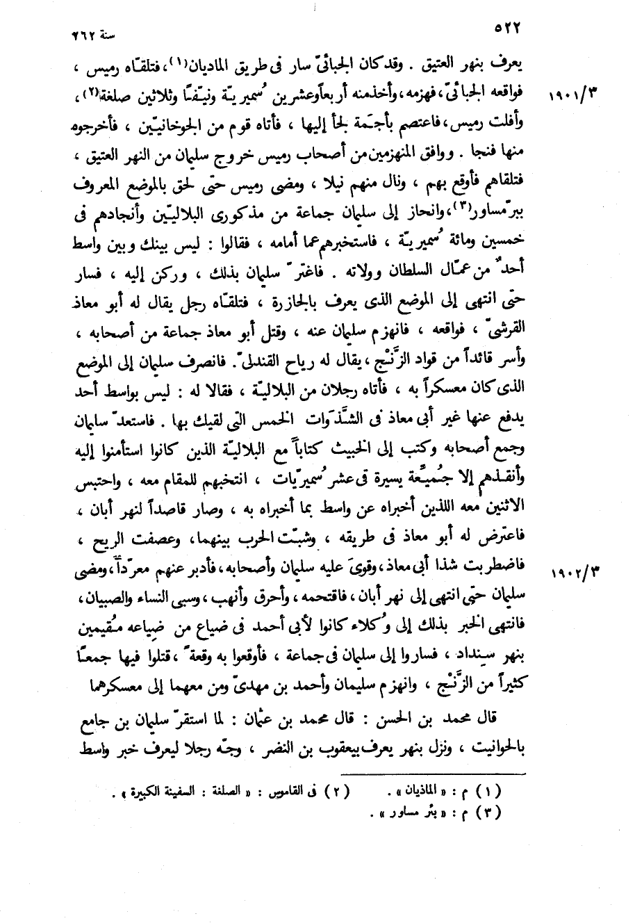 يعرف بنهر العتيق وقد كان الجبائي سار في طريق الماديان، فتلقاه رميس، فواقعه الجبائي، فهزمه، وأخذ منه أربعا وعشرين سميرية ونيفا وثلاثين صلغة، وأفلت رميس، فاعتصم بأجمة لجأ إليها، فأتاه قوم من الجوخانيين، فأخرجوه منها فنجا ووافق المنهزمين من أصحاب رميس خروج سليمان من النهر العتيق، فتلقاهم فأوقع بهم، ونال منهم نيلا، ومضى رميس حتى لحق بالموضع المعروف ببر مساور، وانحاز إلى سليمان جماعة من مذكوري البلاليين وأنجادهم في خمسين ومائة سميرية، فاستخبرهم عما أمامه، فقالوا: ليس بينك وبين واسط أحد من عمال السلطان وولاته فاغتر سليمان بذلك، وركن إليه، فسار حتى انتهى إلى الموضع الذي يعرف بالجازرة، فتلقاه رجل يقال له أبو معاذ القرشي، فواقعه، فانهزم سليمان عنه، وقتل أبو معاذ جماعة من أصحابه، وأسر قائدا من قواد الزنج، يقال له رياح القندلي فانصرف سليمان إلى الموضع الذي كان معسكرا به، فأتاه رجلان من البلالية، فقالا له: ليس بواسط أحد يدفع عنها غير أبي معاذ في الشذوات الخمس التي لقيك بها فاستعد سليمان وجمع أصحابه وكتب إلى الخبيث كتابا مع البلالية الذين كانوا استأمنوا إليه وأنقذهم إلا جميعة يسيرة في عشر سميريات، انتخبهم للمقام معه، واحتبس الاثنين معه اللذين أخبراه عن واسط بما أخبراه به، وصار قاصدا لنهر أبان، فاعترض له أبو معاذ في طريقه، وشبت الحرب بينهما، وعصفت الريح، فاضطربت شذا أبي معاذ، وقوي عليه سليمان وأصحابه، فأدبر عنهم معردا، ومضى سليمان حتى انتهى إلى نهر أبان، فاقتحمه، وأحرق وأنهب، وسبى النساء والصبيان، فانتهى الخبر بذلك إلى وكلاء كانوا لأبي أحمد في ضياع من ضياعه مقيمين بنهر سنداد، فساروا إلى سليمان في جماعة، فأوقعوا به وقعة، قتلوا فيها جمعا كثيرا من الزنج، وانهزم سليمان وأحمد بن مهدي ومن معهما إلى معسكرهما قال محمد بن الحسن: قال محمد بن عثمان: لما استقر سليمان بن جامع بالحوانيت، ونزل بنهر يعرف بيعقوب بن النضر، وجه رجلا ليعرف خبر واسط