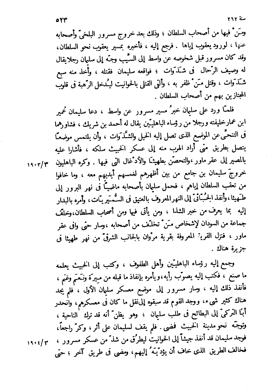 وجمع إليه رؤساء الباهليين وأهل الطفوف، وكتب إلى الخبيث يعلمه ما صنع، فكتب إليه يصوب رأيه، ويأمره بإنفاذ ما قبله من ميرة ونعم وغنم، فأنفذ ذلك إليه، وسار مسرور إلى موضع معسكر سليمان الأول، فلم يجد هناك كثير شيء، ووجد القوم قد سبقوه إلى نقل ما كان في معسكرهم، وانحدر أبا التركي إلى البطائح في طلب سليمان، وهو يظن أنه قد ترك الناحية، وتوجه نحو مدينة الخبيث فمضى فلم يقف لسليمان على أثر، وكر راجعا، فوجد سليمان قد أنفذ جيشا إلى الحوانيت ليطرق من شذ من عسكر مسرور، فخالف الطريق الذي خاف أن يؤديه اليهم، ومضى في طريق آخر
