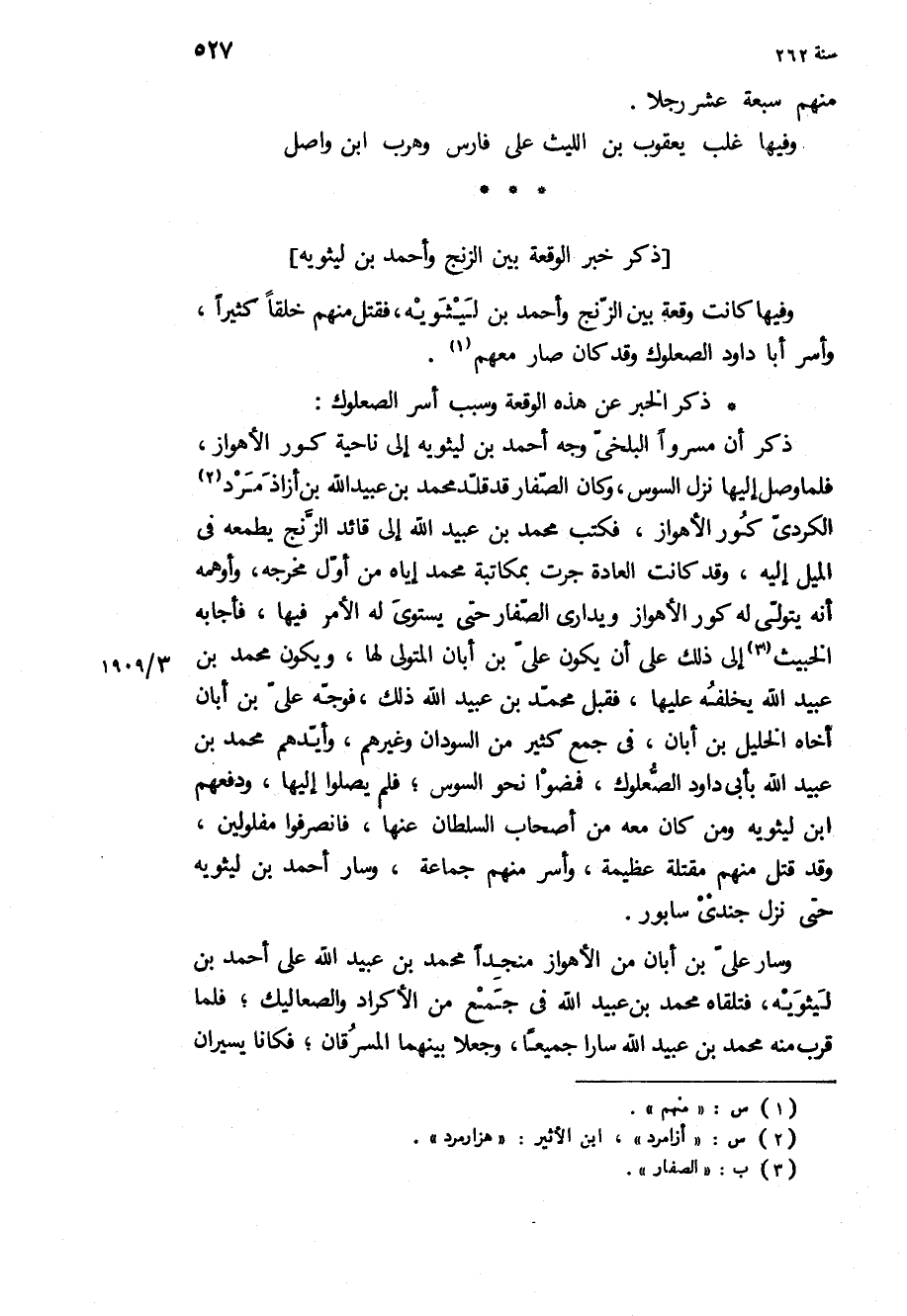 وفيها كانت وقعة بين الزنج وأحمد بن ليثويه، فقتل منهم خلقا كثيرا، وأسر أبا داود الصعلوك وقد كان صار معهم.