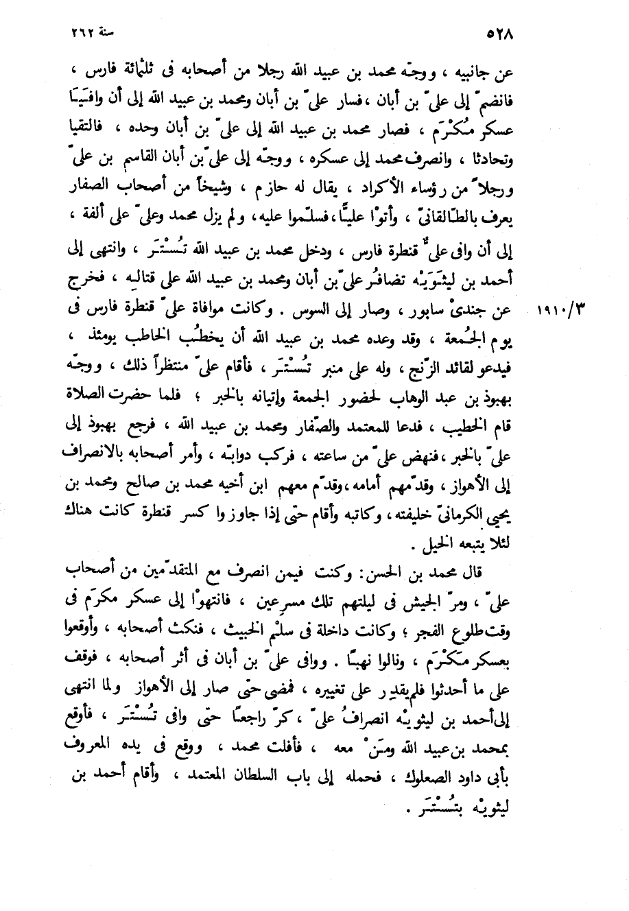 عن جانبيه، ووجه محمد بن عبيد الله رجلا من اصحابه في ثلاثمائة فارس، فانضم إلى علي بن أبان، فسار علي بن أبان ومحمد بن عبيد الله إلى أن وافيا عسكر مكرم، فصار محمد بن عبيد الله إلى علي بن أبان وحده، فالتقيا وتحادثا، وانصرف محمد إلى عسكره، ووجه إلى علي بن أبان القاسم بن علي ورجلا من رؤساء الأكراد، يقال له حازم، وشيخا من أصحاب الصفار يعرف بالطالقاني، وأتوا عليا، فسلموا عليه، ولم يزل محمد وعلي على ألفة، إلى أن وافى علي قنطرة فارس، ودخل محمد بن عبيد الله تستر، وانتهى إلى أحمد بن ليثويه تضافر علي بن أبان ومحمد بن عبيد الله على قتاله، فخرج عن جندي سابور، وصار إلى السوس وكانت موافاة علي قنطرة فارس في يوم الجمعة، وقد وعده محمد بن عبيد الله أن يخطب الخاطب يومئذ، فيدعو لقائد الزنج، وله على منبر تستر، فأقام علي منتظرا ذلك، ووجه بهبوذ بن عبد الوهاب لحضور الجمعة وإتيانه بالخبر، فلما حضرت الصلاة قام الخطيب، فدعا للمعتمد والصفار ومحمد بن عبيد الله، فرجع بهبوذ إلى علي بالخبر، فنهض علي من ساعته، فركب دوابه، وأمر أصحابه بالانصراف إلى الأهواز، وقدمهم أمامه، وقدم معهم ابن أخيه محمد بن صالح ومحمد بن يحيى الكرماني خليفته، وكاتبه وأقام حتى إذا جاوزوا كسر قنطرة كانت هناك لئلا يتبعه الخيل.