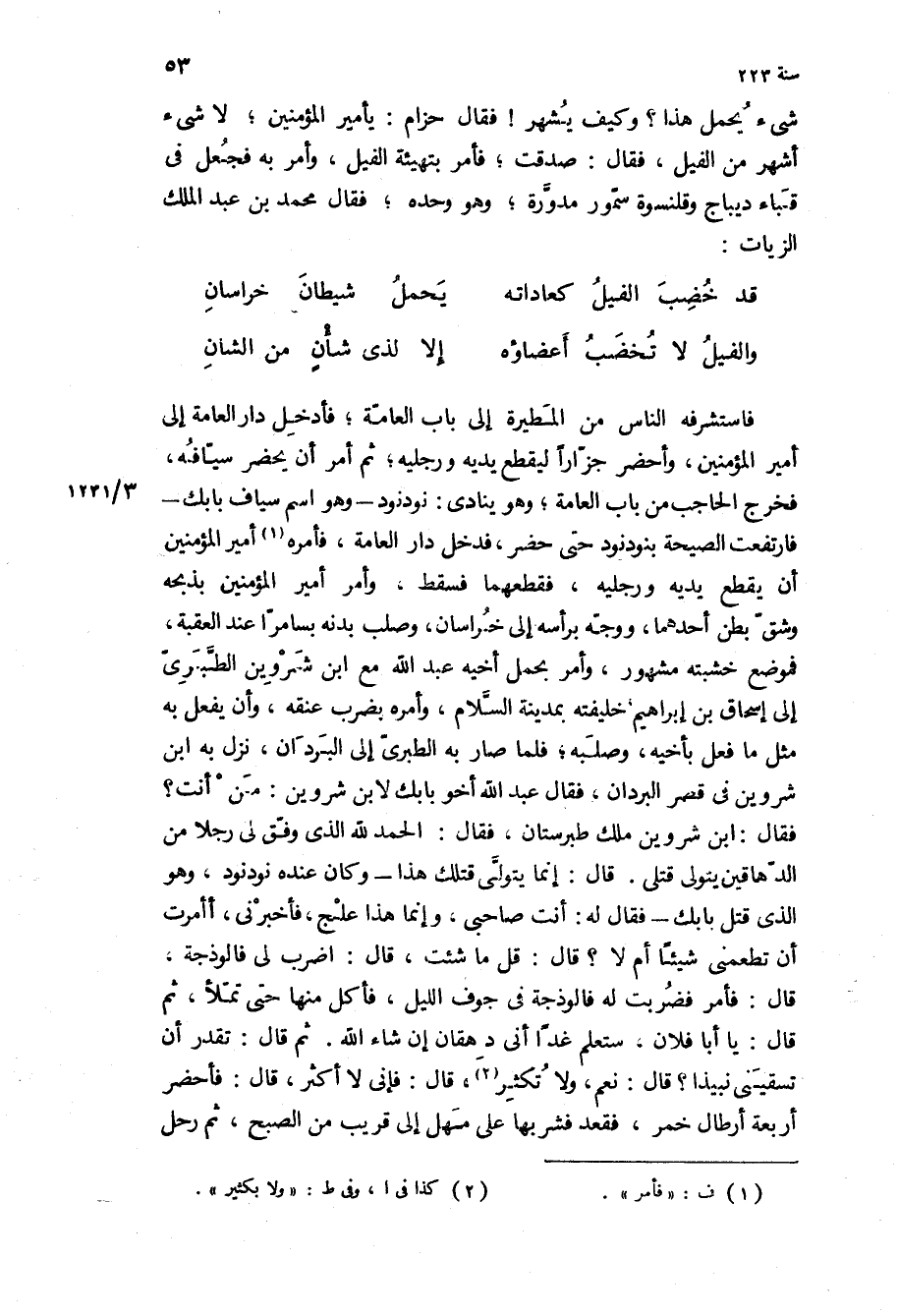 فقال: ابن شروين ملك طبرستان، فقال: الحمد لله الذي وفق لي رجلا من الدهاقين يتولى قتلي قال: إنما يتولى قتلك هذا- وكان عنده نودنود، وهو الذي قتل بابك- فقال له: أنت صاحبي، وإنما هذا علج، فأخبرني، أأمرت ان تطعمني شيئا أم لا؟ قال: قل ما شئت، قال: اضرب لي فالوذجة، قال: فأمر فضربت له فالوذجة في جوف الليل، فأكل منها حتى تملأ، ثم قال: يا أبا فلان، ستعلم غدا أني دهقان إن شاء الله ثم قال: تقدر أن تسقيني نبيذا؟ قال: نعم، ولا تكثر، قال: فإني لا أكثر، قال: فأحضر أربعة أرطال خمر، فقعد فشربها على مهل إلى قريب من الصبح، ثم رحل