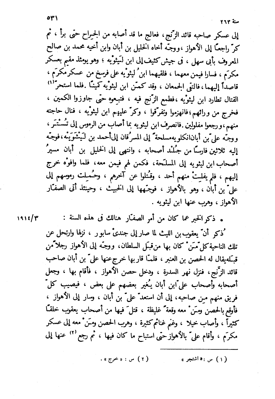 إلى عسكر صاحبه قائد الزنج، فعالج ما قد أصابه من الجراح حتى برأ، ثم كر راجعا إلى الأهواز، ووجه أخاه الخليل بن أبان وابن أخيه محمد بن صالح المعروف بأبي سهل، في جيش كثيف إلى ابن ليثويه، وهو يومئذ مقيم بعسكر مكرم، فسارا فيمن معهما، فلقيهما ابن ليثويه على فرسخ من عسكر مكرم، قاصدا إليهما، فالتقى الجمعان، وقد كمن ابن ليثويه كمينا فلما استحر القتال تطارد ابن ليثويه، فطمع الزنج فيه، فتبعوه حتى جاوزوا الكمين، فخرج من ورائهم، فانهزموا وتفرقوا، وكر عليهم ابن ليثويه، فنال حاجته منهم، ورجعوا مفلولين فانصرف ابن ليثويه بما أصاب من الرءوس إلى تستر، ووجه علي بن أبان أنكلويه مسلحة إلى المسرقان إلى أحمد بن ليثويه، فوجه إليه ثلاثين فارسا من جلد أصحابه، وانتهى إلى الخليل بن أبان مسير أصحاب ابن ليثويه إلى المسلحة، فكمن لهم فيمن معه، فلما وافوه خرج إليهم، فلم يفلت منهم أحد، وقتلوا عن آخرهم، وحملت رءوسهم إلى علي بن أبان، وهو بالأهواز، فوجهها إلى الخبيث، وحينئذ أتى الصفار الأهواز، وهرب عنها ابن ليثويه.