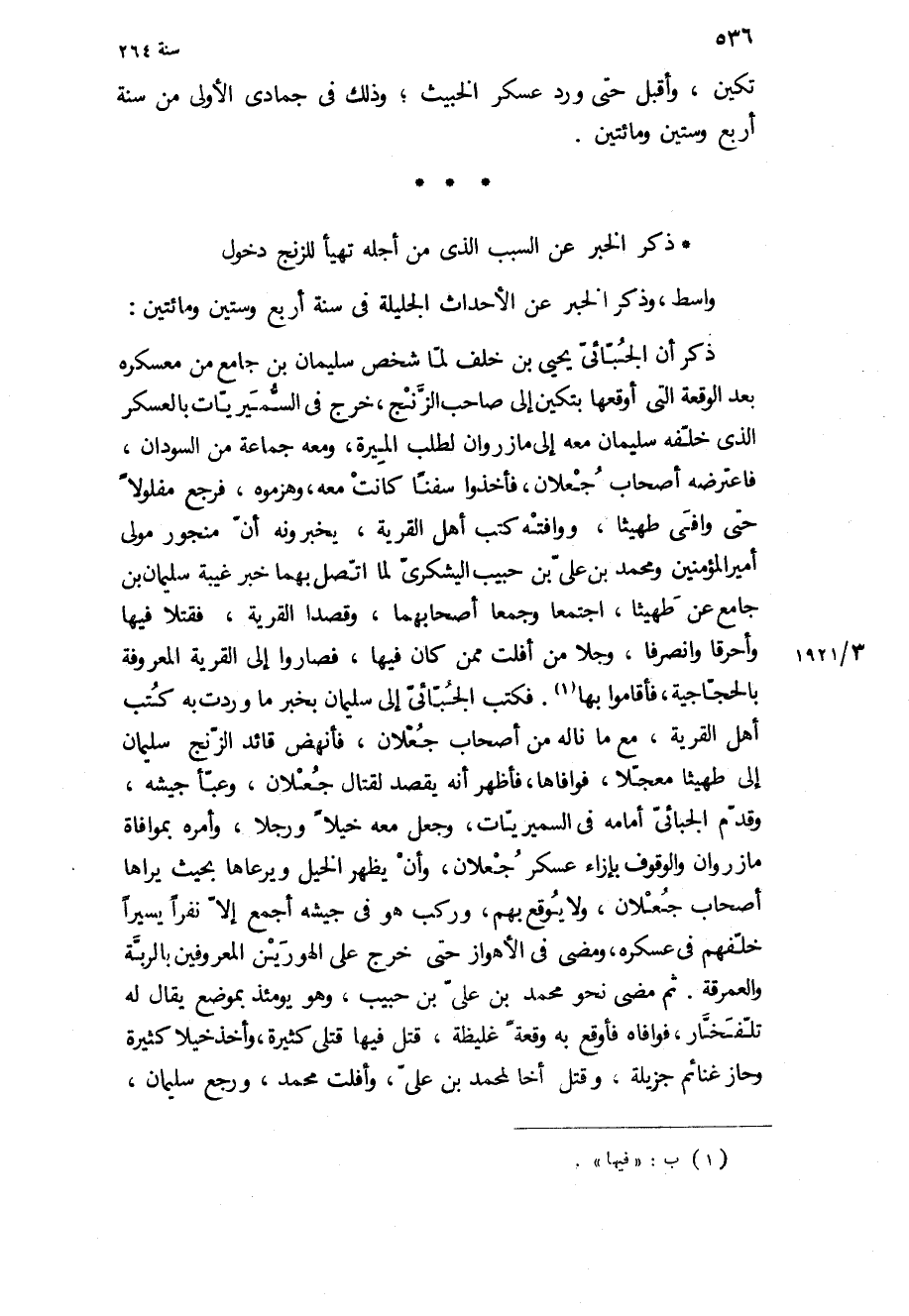 ذكر أن الجبائي يحيى بن خلف لما شخص سليمان بن جامع من معسكره بعد الوقعة التي أوقعها بتكين إلى صاحب الزنج، خرج في السميريات بالعسكر الذي خلفه سليمان معه إلى مازروان لطلب الميرة، ومعه جماعة من السودان، فاعترضه أصحاب جعلان، فأخذوا سفنا كانت معه، وهزموه، فرجع مفلولا حتى وافى طهيثا، ووافته كتب أهل القرية، يخبرونه أن منجور مولى أمير المؤمنين ومحمد بن علي بن حبيب اليشكري لما اتصل بهما خبر غيبة سليمان بن جامع عن طهيثا، اجتمعا وجمعا أصحابهما، وقصدا القرية، فقتلا فيها وأحرقا وانصرفا، وجلا من أفلت ممن كان فيها، فصاروا إلى القرية المعروفة بالحجاجية، فأقاموا بها فكتب الجبائي إلى سليمان بخبر ما وردت به كتب أهل القرية، مع ما ناله من أصحاب جعلان، فأنهض قائد الزنج سليمان إلى طهيثا معجلا، فوافاها، فأظهر أنه يقصد لقتال جعلان، وعبأ جيشه، وقدم الجبائي أمامه في السميريات، وجعل معه خيلا ورجلا، وأمره بموافاة مازروان والوقوف بإزاء عسكر جعلان، وأن يظهر الخيل ويرعاها بحيث يراها أصحاب جعلان، ولا يوقع بهم، وركب هو في جيشه أجمع إلا نفرا يسيرا خلفهم في عسكره، ومضى في الأهواز حتى خرج على الهورين المعروفين بالربة والعمرقة ثم مضى نحو محمد بن علي بن حبيب، وهو يومئذ بموضع يقال له تلفخار، فوافاه فأوقع به وقعة غليظة، قتل فيها قتلى كثيرة، وأخذ خيلا كثيرة وحاز غنائم جزيلة، وقتل أخا لمحمد بن علي، وأفلت محمد، ورجع سليمان،