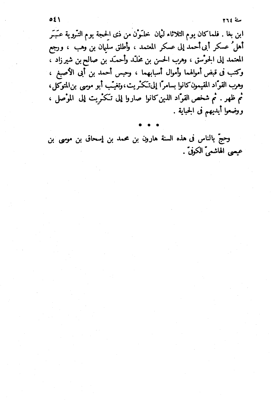 ابن بغا فلما كان يوم الثلاثاء لثمان خلون من ذي الحجة يوم التروية عبر أهل عسكر أبي أحمد إلى عسكر المعتمد، وأطلق سليمان بن وهب، ورجع المعتمد إلى الجوسق، وهرب الحسن بن مخلد وأحمد بن صالح بن شيرزاد، وكتب في قبض أموالهما وأموال أسبابهما، وحبس أحمد بن أبي الأصبغ، وهرب القواد المقيمون كانوا بسامرا إلى تكريت، وتغيب أبو موسى بن المتوكل، ثم ظهر ثم شخص القواد الذين كانوا صاروا إلى تكريت الى الموصل، ووضعوا ايديهم في الجبايه.