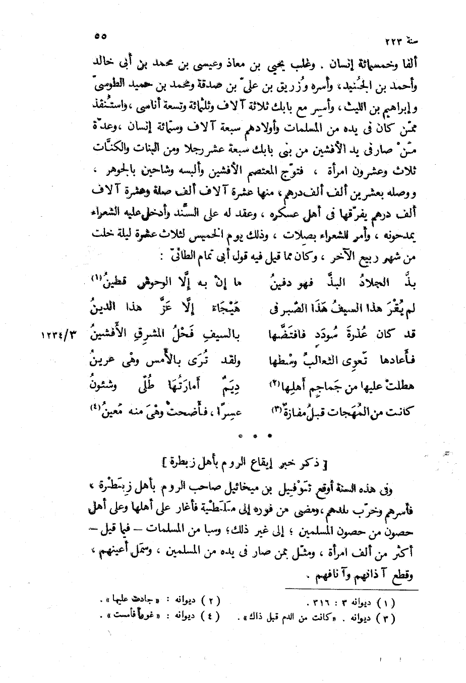 وفي هذه السنة أوقع توفيل بن ميخائيل صاحب الروم بأهل زبطرة، فأسرهم وخرب بلدهم، ومضى من فوره إلى ملطية فأغار على أهلها وعلى أهل حصون من حصون المسلمين، إلى غير ذلك، وسبا من المسلمات- فيما قيل- أكثر من ألف امرأة، ومثل بمن صار في يده من المسلمين، وسمل أعينهم، وقطع آذانهم وآنافهم.