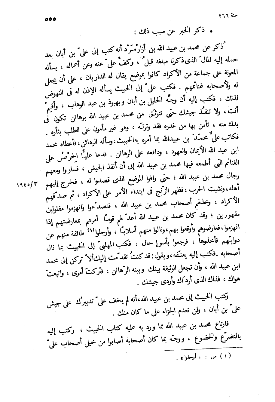 فكاتب علي محمد بن عبيد الله بما أمره به الخبيث، وسأله الرهائن، فأعطاه محمد ابن عبد الله الأيمان والعهود، ودافعه على الرهائن فدعا عليا الحرص على الغنائم التي أطمعه فيها محمد بن عبيد الله إلى أن أنفذ الجيش، فساروا ومعهم رجال محمد بن عبيد الله، حتى وافوا الموضع الذي قصدوا له، فخرج إليهم أهله، ونشبت الحرب، فظهر الزنج في ابتداء الأمر على الأكراد، ثم صدقهم الأكراد، وخذلهم أصحاب محمد بن عبيد الله، فتصدعوا وانهزموا مفلولين مقهورين، وقد كان محمد بن عبيد الله أعد لهم قوما أمرهم بمعارضتهم إذا انهزموا، فعارضوهم وأوقعوا بهم، ونالوا منهم أسلابا، وأرجلوا طائفة منهم عن دوابهم فأخذوها، فرجعوا بأسوأ حال، فكتب المهلبي إلى الخبيث بما نال أصحابه فكتب إليه يعنفه، ويقول: قد كنت تقدمت إليك إلا تركن الى محمد ابن عبيد الله، وأن تجعل الوثيقة بينك وبينه الرهائن، فتركت أمري، واتبعت هواك، فذاك الذي أرداك وأردى جيشك.