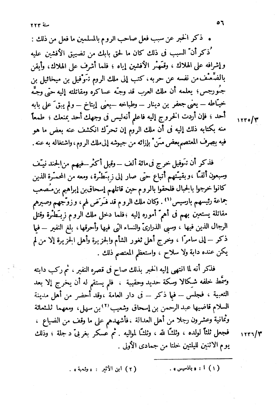 فذكر أن توفيل خرج في مائة ألف- وقيل أكثر- فيهم من الجند نيف وسبعون ألفا، وبقيتهم أتباع حتى صار إلى زبطرة، ومعه من المحمرة الذين كانوا خرجوا بالجبال فلحقوا بالروم حين قاتلهم إسحاق بن إبراهيم بن مصعب جماعة رئيسهم بارسيس وكان ملك الروم قد فرض لهم، وزوجهم وصيرهم مقاتلة يستعين بهم في أهم أموره إليه، فلما دخل ملك الروم زبطرة وقتل الرجال الذين فيها، وسبى الذراري والنساء التي فيها وأحرقها، بلغ النفير- فيما ذكر- إلى سامرا، وخرج أهل ثغور الشام والجزيرة وأهل الجزيرة إلا من لم يكن عنده دابة ولا سلاح، واستعظم المعتصم ذلك.