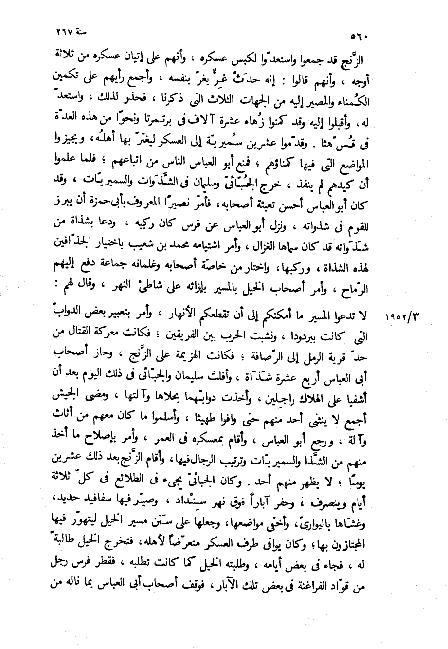 لا تدعوا المسير ما أمكنكم إلى أن تقطعكم الأنهار، وأمر بتعبير بعض الدواب التي كانت ببردودا، ونشبت الحرب بين الفريقين، فكانت معركة القتال من حد قرية الرمل إلى الرصافة، فكانت الهزيمة على الزنج، وحاز أصحاب أبي العباس أربع عشرة شذاة، وأفلت سليمان والجبائي في ذلك اليوم بعد أن أشفيا على الهلاك راجلين، وأخذت دوابهما بحلاها وآلتها، ومضى الجيش أجمع لا ينثني أحد منهم حتى وافوا طهيثا، وأسلموا ما كان معهم من أثاث وآلة، ورجع أبو العباس، وأقام بمعسكره في العمر، وأمر بإصلاح ما أخذ منهم من الشذا والسميريات وترتيب الرجال فيها، وأقام الزنج بعد ذلك عشرين يوما، لا يظهر منهم أحد وكان الجبائي يجيء في الطلائع في كل ثلاثة أيام وينصرف، وحفر آبارا فوق نهر سنداد، وصير فيها سفافيد حديد، وغشاها بالبواري، وأخفى مواضعها، وجعلها على سنن مسير الخيل ليتهور فيها المجتازون بها، وكان يوافي طرف العسكر متعرضا لأهله، فتخرج الخيل طالبة له، فجاء في بعض أيامه، وطلبته الخيل كما كانت تطلبه، فقطر فرس رجل من قواد الفراغنة في بعض تلك الآبار، فوقف أصحاب أبي العباس بما ناله من