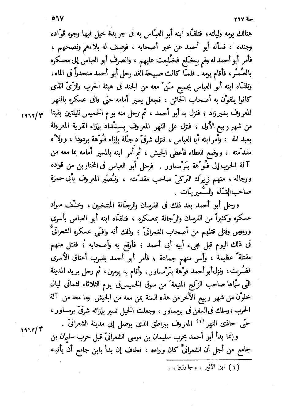 هنالك يومه وليلته، فتلقاه ابنه أبو العباس به في جريدة خيل فيها وجوه قواده وجنده، فسأله أبو أحمد عن خبر أصحابه، فوصف له بلاءهم ونصحهم، فأمر أبو أحمد له ولهم بخلع فخلعت عليهم، وانصرف أبو العباس إلى معسكره بالعمر، فأقام يومه فلما كانت صبيحة الغد رحل أبو أحمد منحدرا في الماء، وتلقاه ابنه أبو العباس بجميع من معه من الجند في هيئة الحرب والزي الذي كانوا يلقون به أصحاب الخائن، فجعل يسير أمامه حتى وافى عسكره بالنهر المعروف بشيرزاد، فنزل به أبو أحمد، ثم رحل منه يوم الخميس لليلتين بقيتا من شهر ربيع الأول، فنزل على النهر المعروف بسنداد بإزاء القرية المعروفة بعبد الله، وأمر ابنه أبا العباس، فنزل شرقي دجلة بإزاء فوهة بردودا، وولاه مقدمته، ووضع العطاء فأعطى الجيش، ثم أمر ابنه بالمسير أمامه بما معه من آله الحرب الى فوهه برمساور فرحل أبو العباس في المختارين من قواده ورجاله، منهم زيرك التركي صاحب مقدمته، ونصير المعروف بأبي حمزة صاحب الشذا والسميريات.