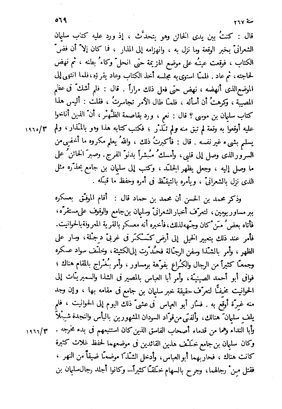قال: كنت بين يدي الخائن وهو يتحدث، إذ ورد عليه كتاب سليمان الشعراني بخبر الوقعة وما نزل به، وانهزامه إلى المذار، فما كان إلا أن فض الكتاب، فوقعت عينه على موضع الهزيمة حتى انحل وكاء بطنه، ثم نهض لحاجته، ثم عاد فلما استوى به مجلسه أخذ الكتاب وعاد يقرؤه، فلما انتهى إلى الموضع الذي أنهضه، نهض حتى فعل ذلك مرارا قال: فلم أشك في عظم المصيبة، وكرهت أن أسأله، فلما طال الأمر تجاسرت، فقلت: أليس هذا كتاب سليمان بن موسى؟ قال: نعم، ورد بقاصمة الظهر، أن الذين أناخوا عليه أوقعوا به وقعة لم تبق منه ولم تذر، فكتب كتابه هذا وهو بالمذار، ولم يسلم بشيء غير نفسه قال: فأكبرت ذلك، والله يعلم مكروه ما أخفي من السرور الذي وصل إلى قلبي، وأمسك مبشرا بدنو الفرج وصبر الخائن على ما وصل إليه، وجعل يظهر الجلد، وكتب إلى سليمان بن جامع يحذره مثل الذي نزل بالشعراني، ويأمره بالتيقظ في أمره وحفظ ما قبله.