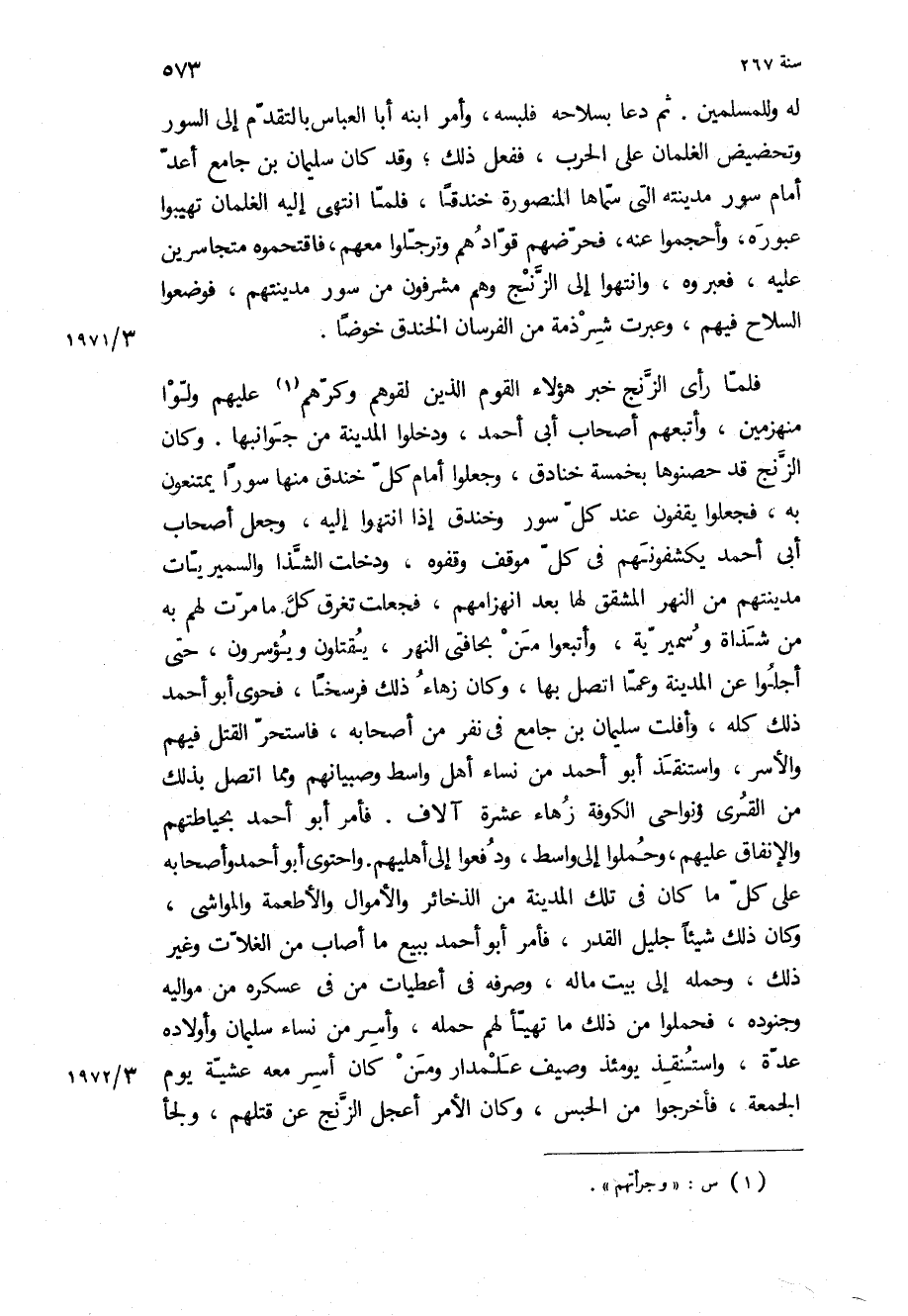 له وللمسلمين ثم دعا بسلاحه فلبسه، وأمر ابنه أبا العباس بالتقدم إلى السور وتحضيض الغلمان على الحرب، ففعل ذلك، وقد كان سليمان بن جامع أعد أمام سور مدينته التي سماها المنصورة خندقا، فلما انتهى إليه الغلمان تهيبوا عبوره، وأحجموا عنه، فحرضهم قوادهم وترجلوا معهم، فاقتحموه متجاسرين عليه، فعبروه، وانتهوا إلى الزنج وهم مشرفون من سور مدينتهم، فوضعوا السلاح فيهم، وعبرت شرذمة من الفرسان الخندق خوضا.