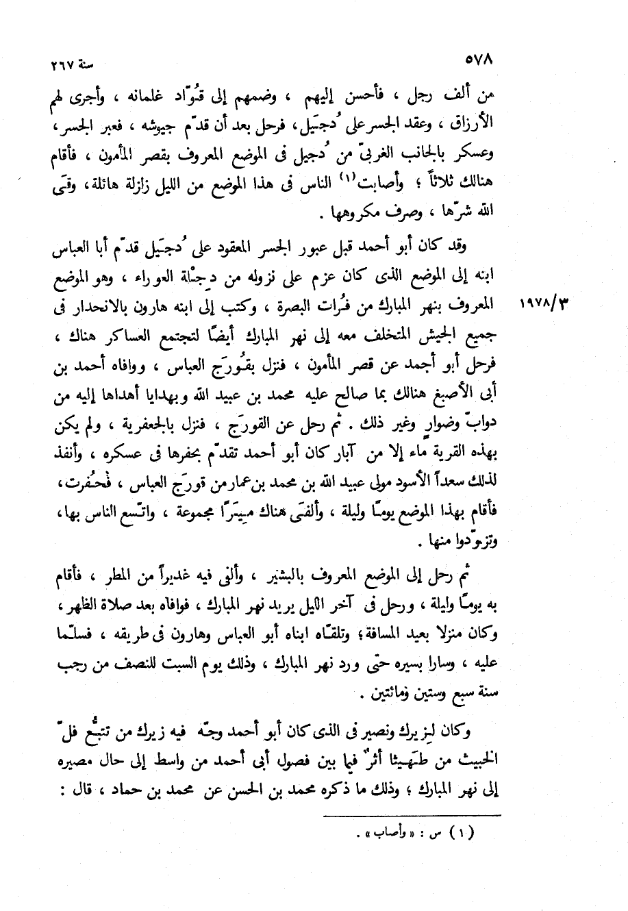 من ألف رجل، فأحسن إليهم، وضمهم إلى قواد غلمانه، وأجرى لهم الأرزاق، وعقد الجسر على دجيل، فرحل بعد أن قدم جيوشه، فعبر الجسر، وعسكر بالجانب الغربي من دجيل في الموضع المعروف بقصر المأمون، فأقام هنالك ثلاثا، وأصابت الناس في هذا الموضع من الليل زلزلة هائلة، وقى الله شرها، وصرف مكروهها وقد كان أبو أحمد قبل عبور الجسر المعقود على دجيل قدم أبا العباس ابنه إلى الموضع الذي كان عزم على نزوله من دجلة العوراء، وهو الموضع المعروف بنهر المبارك من فرات البصره، وكتب الى ابنه هارون بالانحدار في جميع الجيش المتخلف معه إلى نهر المبارك أيضا لتجتمع العساكر هناك، فرحل ابو اجمد عن قصر المأمون، فنزل بقورج العباس، ووافاه أحمد بن أبي الأصبغ هنالك بما صالح عليه محمد بن عبيد الله وبهدايا أهداها إليه من دواب وضوار وغير ذلك ثم رحل عن القورج، فنزل بالجعفرية، ولم يكن بهذه القرية ماء إلا من آبار كان أبو أحمد تقدم بحفرها في عسكره، وأنفذ لذلك سعدا الأسود مولى عبيد الله بن محمد بن عمار من قورج العباس، فحفرت، فأقام بهذا الموضع يوما وليلة، وألفى هناك ميرا مجموعة، واتسع الناس بها، وتزودوا منها.