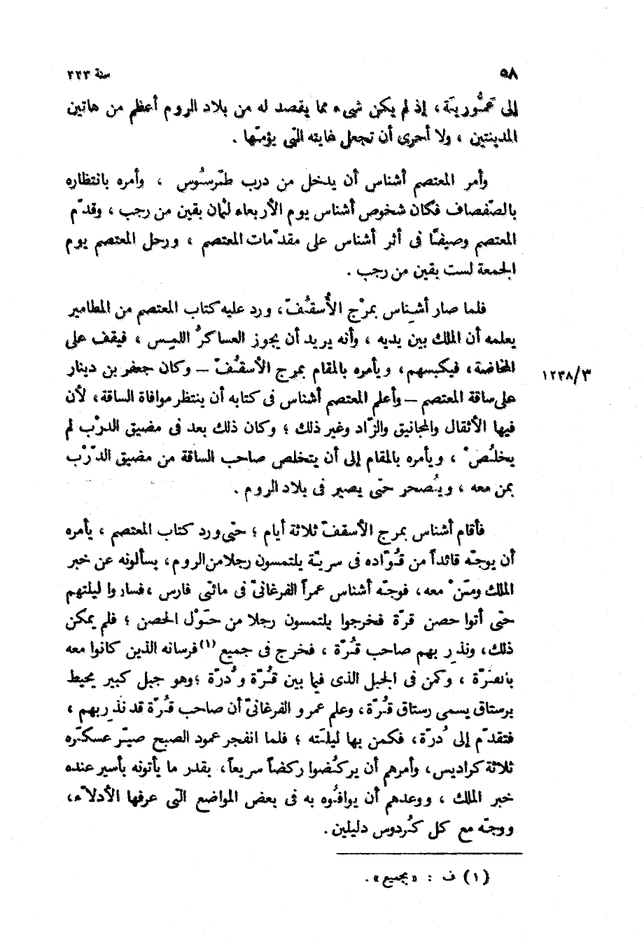 فلما صار أشناس بمرج الأسقف، ورد عليه كتاب المعتصم من المطامير يعلمه أن الملك بين يديه، وأنه يريد أن يجوز العساكر اللمس، فيقف على المخاضة، فيكبسهم، ويأمره بالمقام بمرج الأسقف- وكان جعفر بن دينار على ساقة المعتصم- وأعلم المعتصم أشناس في كتابه أن ينتظر موافاة الساقة، لأن فيها الأثقال والمجانيق والزاد وغير ذلك، وكان ذلك بعد في مضيق الدرب لم يخلص، ويأمره بالمقام إلى أن يتخلص صاحب الساقة من مضيق الدرب بمن معه، ويصحر حتى يصير في بلاد الروم.