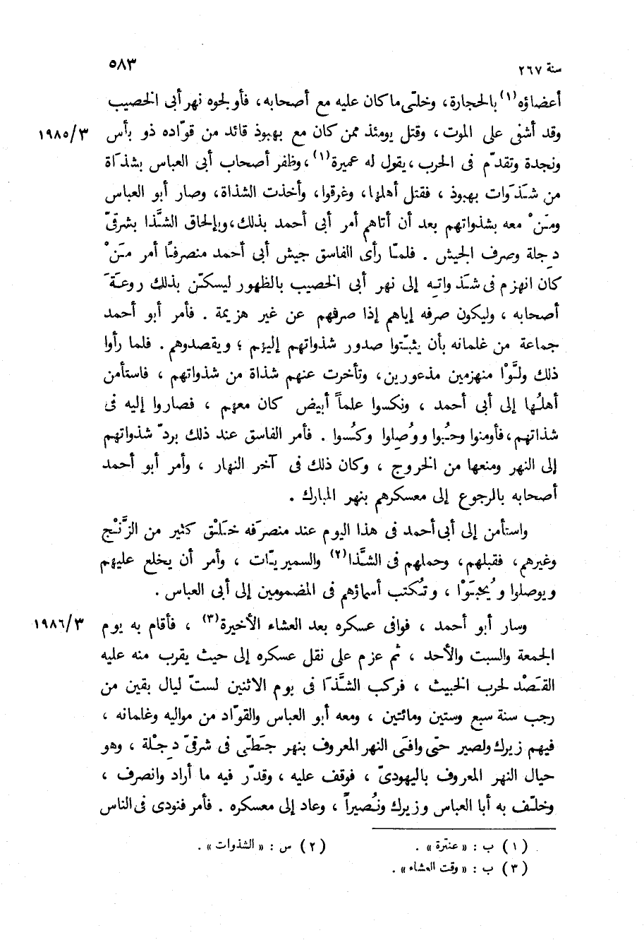 أعضاؤه بالحجارة، وخلى ما كان عليه مع أصحابه، فأولجوه نهر أبي الخصيب وقد أشفى على الموت، وقتل يومئذ ممن كان مع بهبوذ قائد من قواده ذو بأس ونجدة وتقدم في الحرب، يقول له عميرة، وظفر أصحاب أبي العباس بشذاة من شذوات بهبوذ، فقتل أهلها، وغرقوا، وأخذت الشذاة، وصار أبو العباس ومن معه بشذواتهم بعد أن أتاهم أمر أبي أحمد بذلك، وبإلحاق الشذا بشرقي دجلة وصرف الجيش فلما رأى الفاسق جيش أبي أحمد منصرفا أمر من كان انهزم في شذواته إلى نهر أبي الخصيب بالظهور ليسكن بذلك روعة أصحابه، وليكون صرفه إياهم إذا صرفهم عن غير هزيمة فأمر أبو أحمد جماعة من غلمانه بأن يثبتوا صدور شذواتهم إليهم، ويقصدوهم فلما رأوا ذلك ولوا منهزمين مذعورين، وتأخرت عنهم شذاة من شذواتهم، فاستأمن أهلها إلى أبي أحمد، ونكسوا علما أبيض كان معهم، فصاروا إليه في شذاتهم، فأومنوا وحبوا ووصلوا وكسوا فأمر الفاسق عند ذلك برد شذواتهم إلى النهر ومنعها من الخروج، وكان ذلك في آخر النهار، وأمر أبو أحمد أصحابه بالرجوع إلى معسكرهم بنهر المبارك.