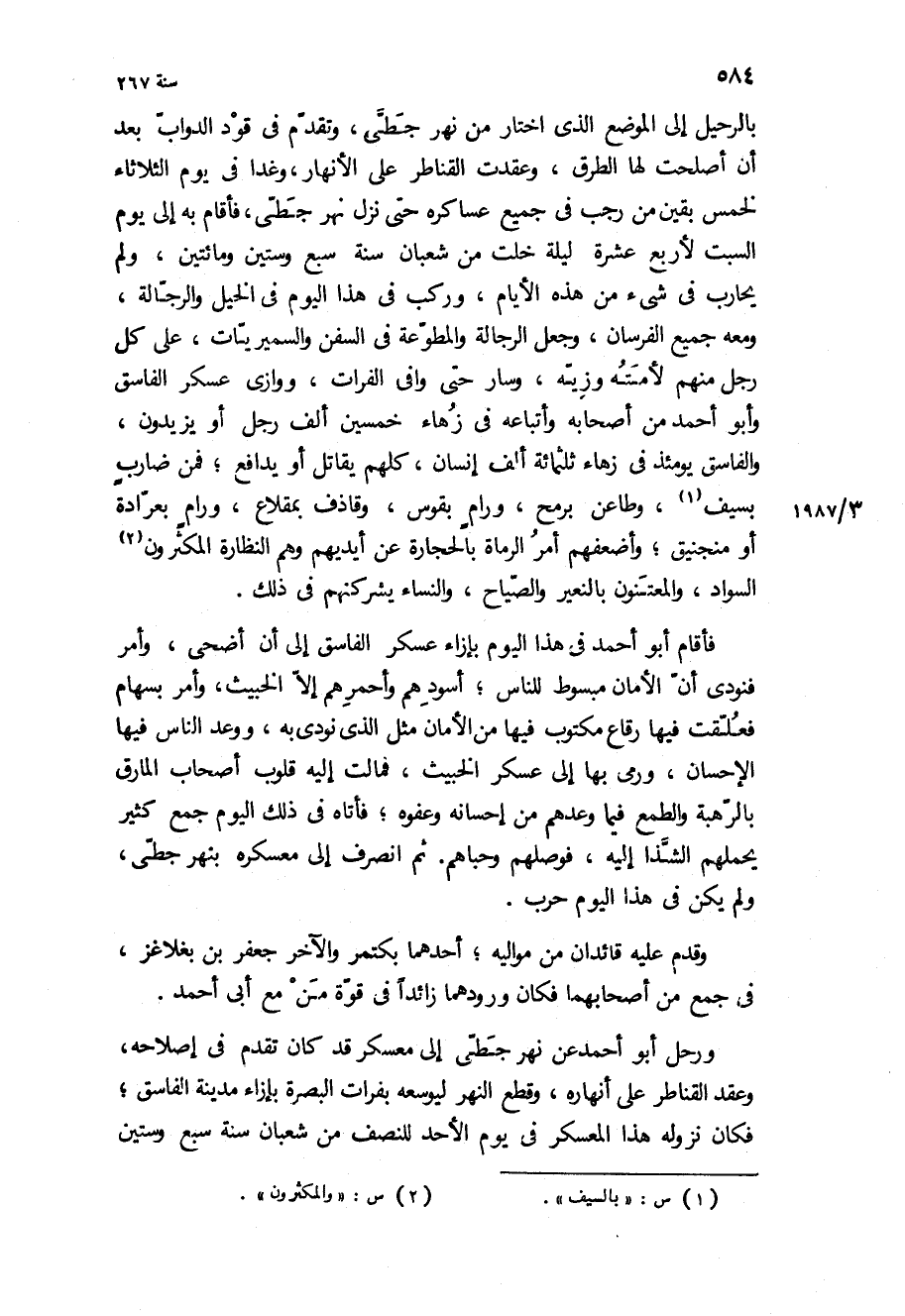 بالرحيل إلى الموضع الذي اختار من نهر جطى، وتقدم في قود الدواب بعد أن أصلحت لها الطرق، وعقدت القناطر على الأنهار، وغدا في يوم الثلاثاء لخمس بقين من رجب في جميع عساكره حتى نزل نهر جطى، فأقام به إلى يوم السبت لأربع عشرة ليلة خلت من شعبان سنة سبع وستين ومائتين، ولم يحارب في شيء من هذه الأيام، وركب في هذا اليوم في الخيل والرجالة، ومعه جميع الفرسان، وجعل الرجالة والمطوعة في السفن والسميريات، على كل رجل منهم لأمته وزيه، وسار حتى وافى الفرات، ووازى عسكر الفاسق وأبو أحمد من أصحابه وأتباعه في زهاء خمسين ألف رجل أو يزيدون، والفاسق يومئذ في زهاء ثلاثمائة ألف إنسان، كلهم يقاتل أو يدافع، فمن ضارب بسيف، وطاعن برمح، ورام بقوس، وقاذف بمقلاع، ورام بعراده او منجنيق، واضعفهم امر الرماة بالحجارة عن أيديهم وهم النظارة المكثرون السواد، والمعتنون بالنعير والصياح، والنساء يشركنهم في ذلك.
