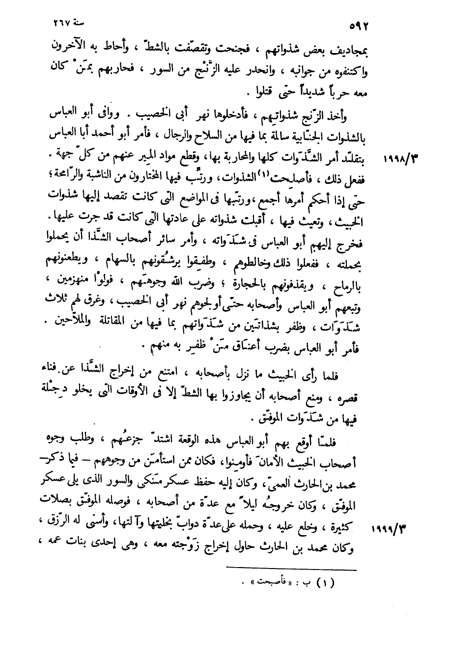 بمجاديف بعض شذواتهم، فجنحت وتقصفت بالشط، وأحاط به الآخرون واكتنفوه من جوانبه، وانحدر عليه الزنج من السور، فحاربهم بمن كان معه حربا شديدا حتى قتلوا وأخذ الزنج شذواتهم، فأدخلوها نهر أبي الخصيب ووافى أبو العباس بالشذوات الجنابية سالمة بما فيها من السلاح والرجال، فأمر أبو أحمد أبا العباس بتقلد أمر الشذوات كلها والمحاربة بها، وقطع مواد المير عنهم من كل جهة.