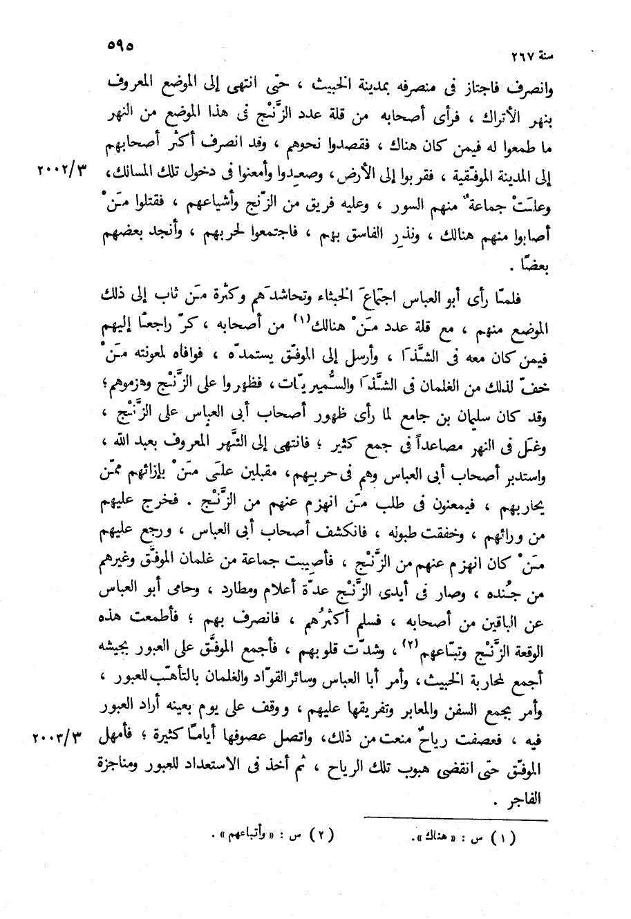 فلما رأى أبو العباس اجتماع الخبثاء وتحاشدهم وكثرة من ثاب إلى ذلك الموضع منهم، مع قلة عدد من هنالك من أصحابه، كر راجعا إليهم فيمن كان معه في الشذا، وأرسل إلى الموفق يستمده، فوافاه لمعونته من خف لذلك من الغلمان في الشذا والسميريات، فظهروا على الزنج وهزموهم، وقد كان سليمان بن جامع لما رأى ظهور أصحاب أبي العباس على الزنج، وغل في النهر مصاعدا في جمع كثير، فانتهى إلى النهر المعروف بعبد الله، واستدبر أصحاب أبي العباس وهم في حربهم، مقبلين على من بإزائهم ممن يحاربهم، فيمعنون في طلب من انهزم عنهم من الزنج فخرج عليهم من ورائهم، وخفقت طبوله، فانكشف أصحاب أبي العباس، ورجع عليهم من كان انهزم عنهم من الزنج، فأصيبت جماعة من غلمان الموفق وغيرهم من جنده، وصار في أيدي الزنج عدة أعلام ومطارد، وحامى أبو العباس عن الباقين من أصحابه، فسلم أكثرهم، فانصرف بهم، فأطمعت هذه الوقعة الزنج وتباعهم، وشدت قلوبهم، فأجمع الموفق على العبور بجيشه أجمع لمحاربة الخبيث، وأمر أبا العباس وسائر القواد والغلمان بالتأهب للعبور، وأمر بجمع السفن والمعابر وتفريقها عليهم، ووقف على يوم بعينه أراد العبور فيه، فعصفت رياح منعت من ذلك، واتصل عصوفها أياما كثيرة، فأمهل الموفق حتى انقضى هبوب تلك الرياح، ثم أخذ في الاستعداد للعبور ومناجزة الفاجر