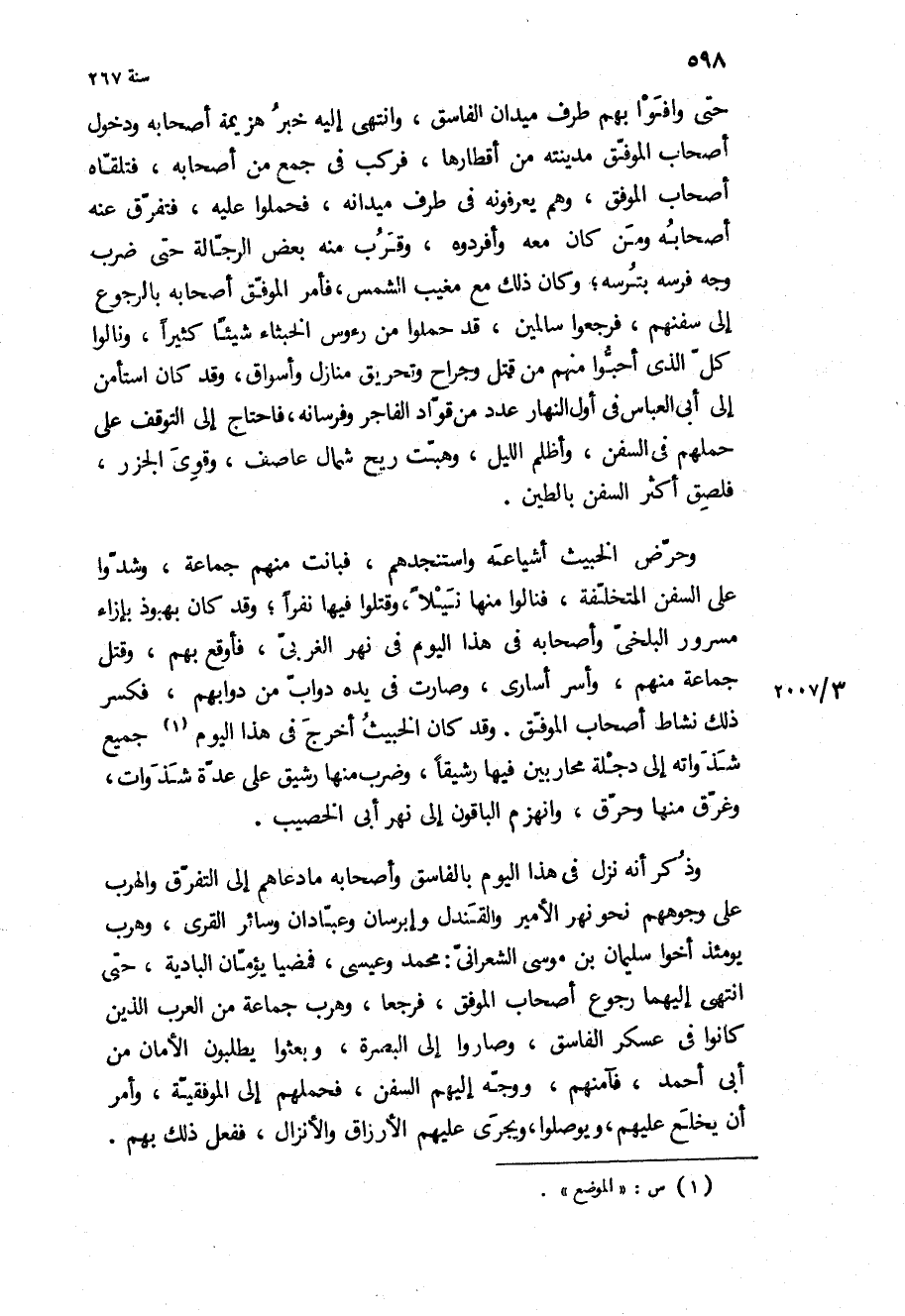 وذكر أنه نزل في هذا اليوم بالفاسق وأصحابه ما دعاهم إلى التفرق والهرب على وجوههم نحو نهر الأمير والقندل وإبرسان وعبادان وسائر القرى، وهرب يومئذ أخوا سليمان بن موسى الشعراني: محمد وعيسى، فمضيا يؤمان البادية، حتى انتهى إليهما رجوع أصحاب الموفق، فرجعا، وهرب جماعة من العرب الذين كانوا في عسكر الفاسق، وصاروا إلى البصرة، وبعثوا يطلبون الأمان من أبي أحمد، فآمنهم، ووجه إليهم السفن، فحملهم إلى الموفقية، وأمر أن يخلع عليهم، ويوصلوا، ويجري عليهم الأرزاق والأنزال، ففعل ذلك بهم