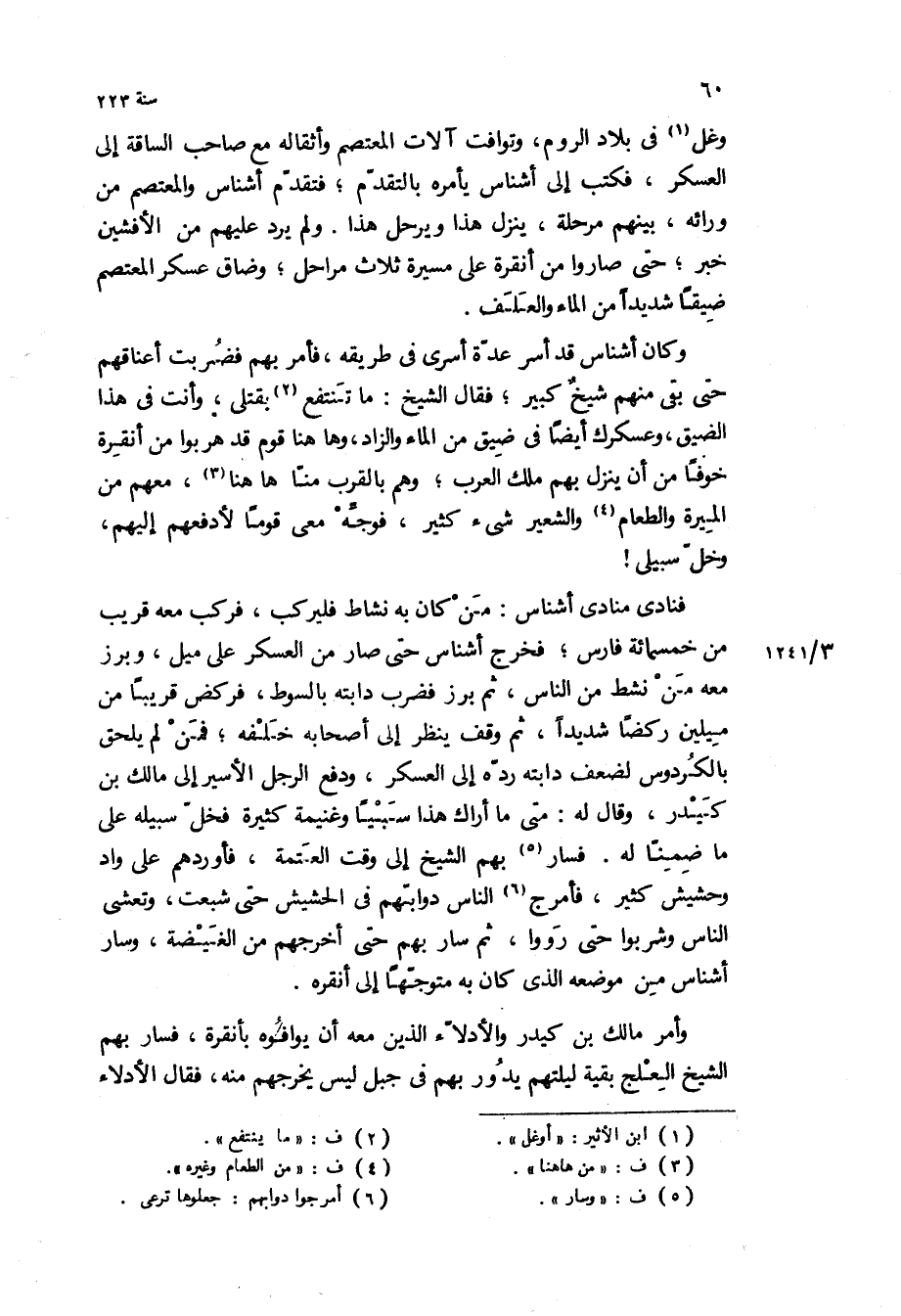 وغل في بلاد الروم، وتوافت آلات المعتصم وأثقاله مع صاحب الساقة إلى العسكر، فكتب إلى أشناس يأمره بالتقدم، فتقدم أشناس والمعتصم من ورائه، بينهم مرحلة، ينزل هذا ويرحل هذا ولم يرد عليهم من الأفشين خبر، حتى صاروا من أنقرة على مسيرة ثلاث مراحل، وضاق عسكر المعتصم ضيقا شديدا من الماء والعلف سنه 223 وكان اشناس قد اسر عده اسرى في طريقه، فأمر بهم فضربت أعناقهم حتى بقي منهم شيخ كبير، فقال الشيخ: ما تنتفع بقتلي، وأنت في هذا الضيق، وعسكرك أيضا في ضيق من الماء والزاد، وهاهنا قوم قد هربوا من أنقرة خوفا من أن ينزل بهم ملك العرب، وهم بالقرب منا هاهنا، معهم من الميرة والطعام والشعير شيء كثير، فوجه معي قوما لأدفعهم إليهم، وخل سبيلي! فنادى منادي أشناس: من كان به نشاط فليركب، فركب معه قريب من خمسمائة فارس، فخرج أشناس حتى صار من العسكر على ميل، وبرز معه من نشط من الناس، ثم برز فضرب دابته بالسوط، فركض قريبا من ميلين ركضا شديدا، ثم وقف ينظر إلى أصحابه خلفه، فمن لم يلحق بالكردوس لضعف دابته رده إلى العسكر، ودفع الرجل الأسير إلى مالك بن كيدر، وقال له: متى ما أراك هذا سبيا وغنيمة كثيرة فخل سبيله على ما ضمنا له فسار بهم الشيخ إلى وقت العتمة، فأوردهم على واد وحشيش كثير، فأمرج الناس دوابهم في الحشيش حتى شبعت، وتعشى الناس وشربوا حتى رووا، ثم سار بهم حتى أخرجهم من الغيضة، وسار أشناس من موضعه الذي كان به متوجها إلى أنقرة.